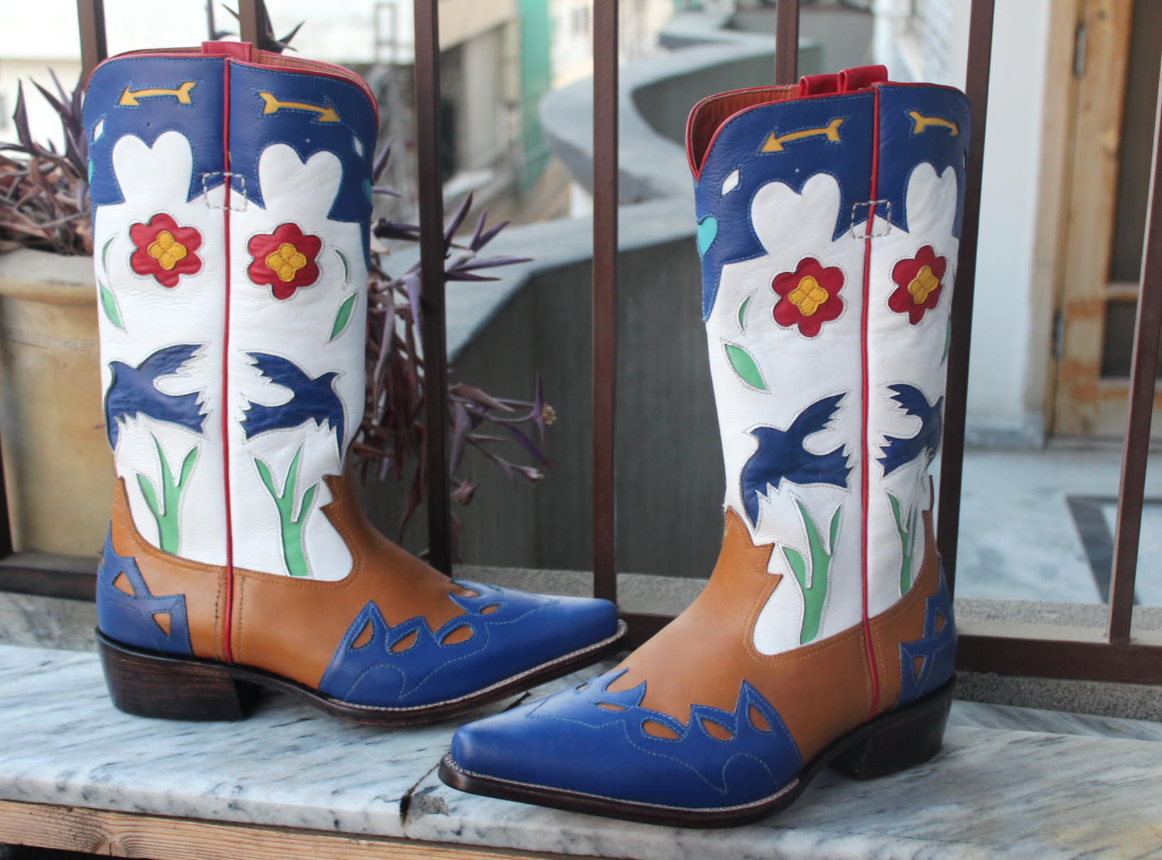 Inner: Soft Leather Sole: Leather Gender : Male Heel: Leather Color: Brown / White / Blue Style: Cowboy Boot Lining Soft Calf Leather Lining Totally Hand stitched Manufacturing time 7-10 business days If you can’t find your Size/Colorjust send us message we will make for you.