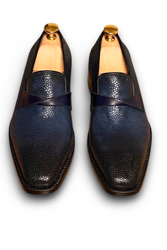 Crafted Leather Handmade Men Classic Blue Stingray Leather Moccasin Loafers Dress Shoes
