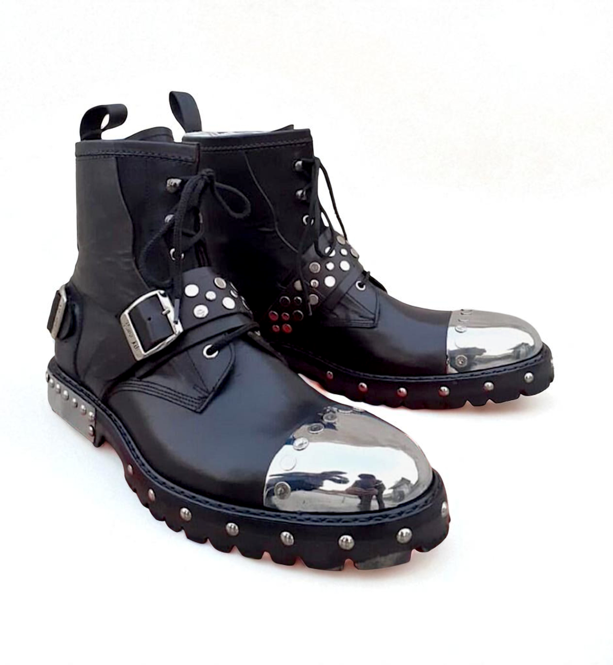 Crafted Leather Handmade Black Leather Metal Toe Strap Ankle High Boot