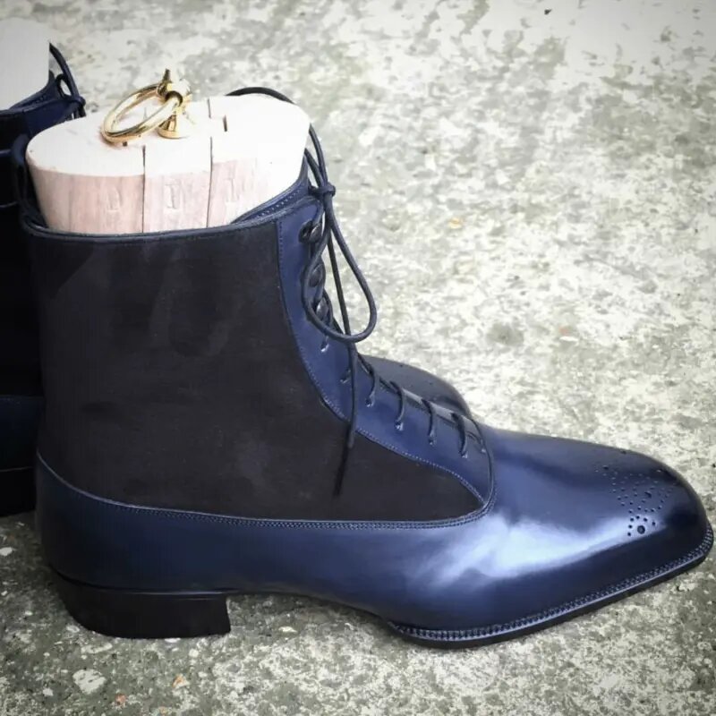 Blue Black Combination Leather / Suede Ankle High Lace up Balmoral Boots
