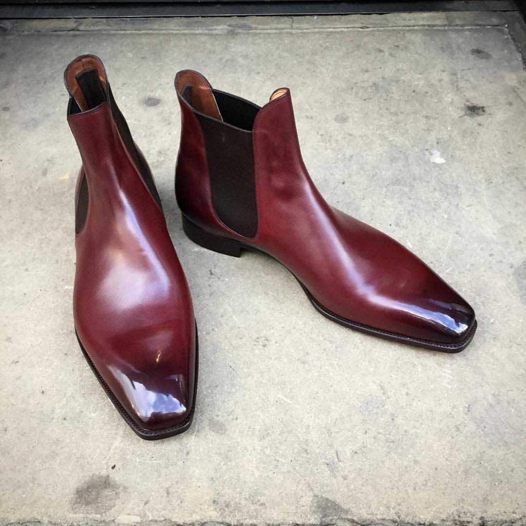 Inner: Soft Leather Sole: Leather Gender : Male Heel: Leather Color: Burgundy Style: Chelsea Boot Lining Soft Calf Leather Lining Totally Hand stitched Manufacturing time 7-10 business days If you can’t find your Size/Colorjust send us message we will make for you.