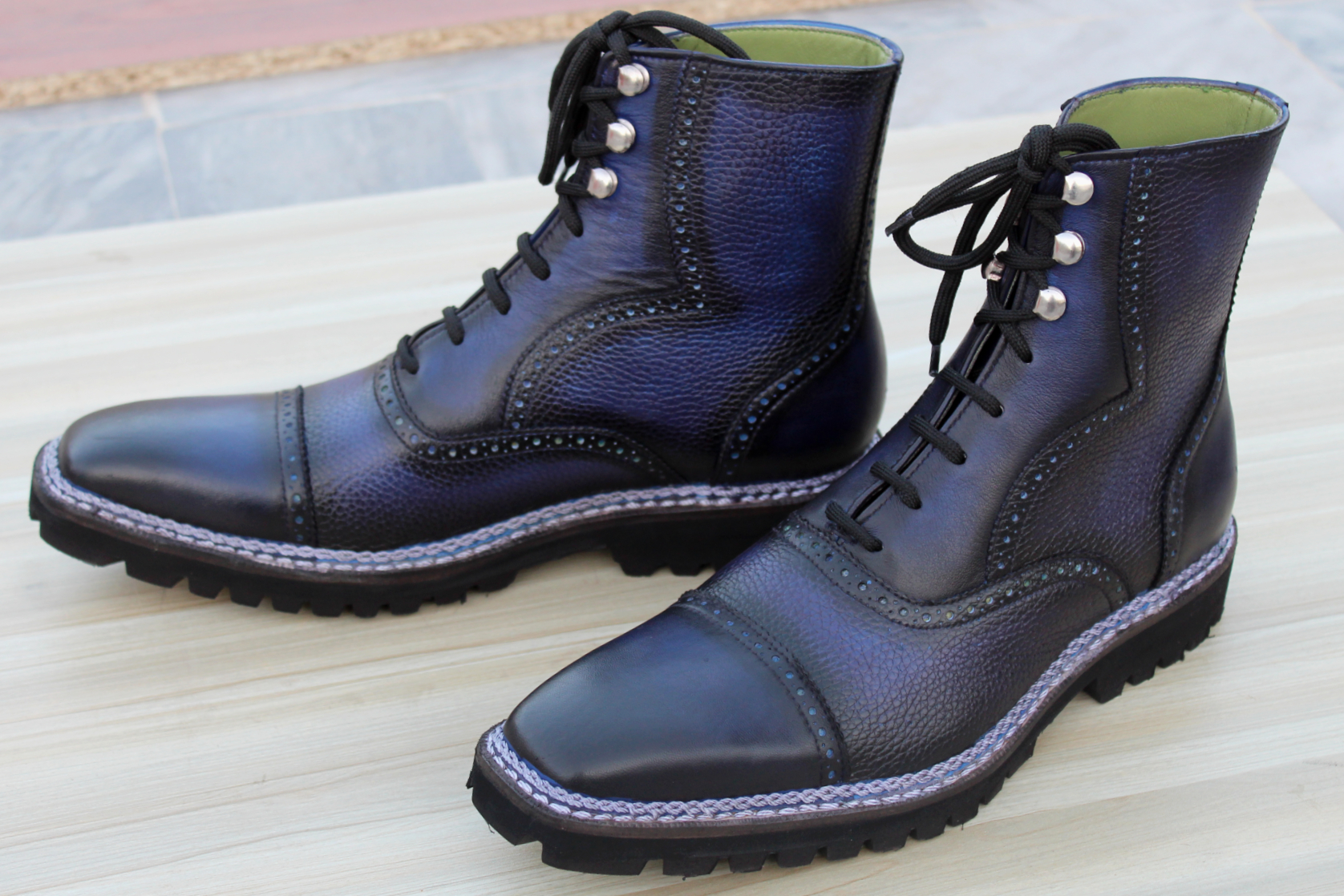 Crafted Leather Classic Dress Shoes Blue Grain Patina Leather Double Norwegian Welted Ankle High Boot