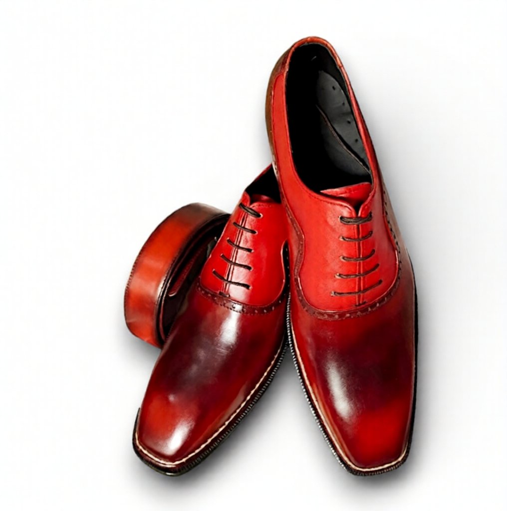 Crafted Leather Classic Handmade Men Burgundy Patina Leather Oxford Lace up Dress Shoes with Matching Belt