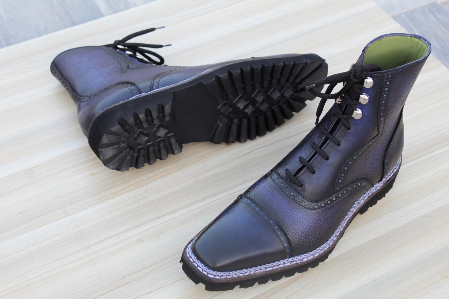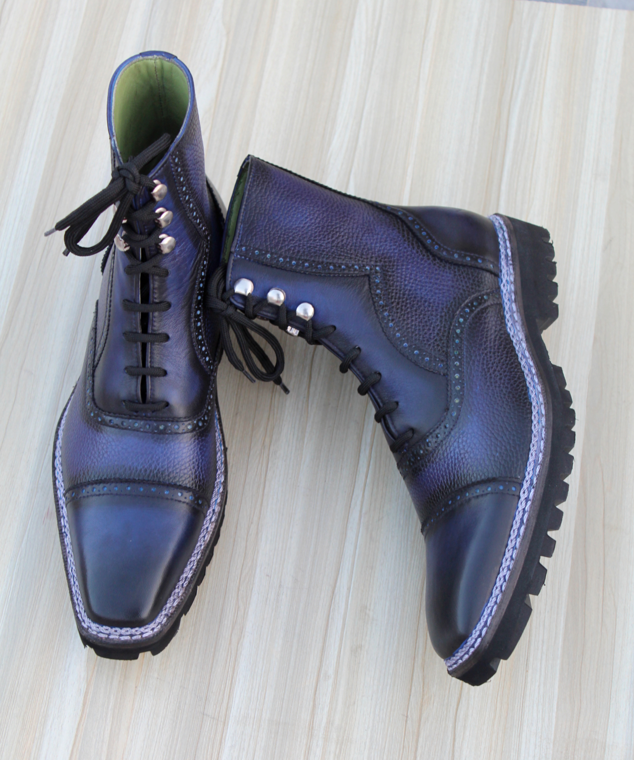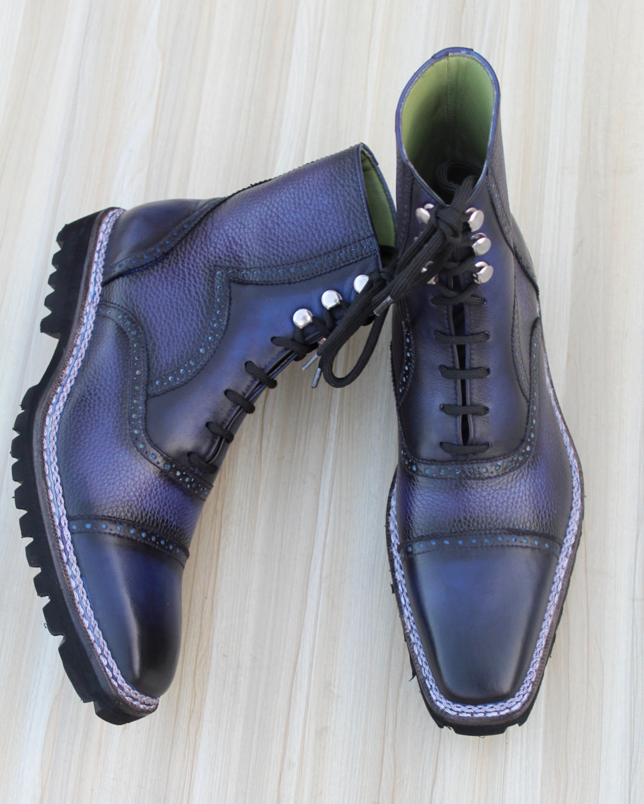 Crafted Leather Luxury Dress Shoes Vintage High Shine Blue Grain Patina Norwegian Commando Vibram Sole Ankle High Adelaide Boot