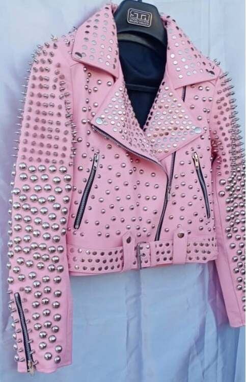 Crafted Leather Women Pink Studded Genuine Leather Punk Style Jacket