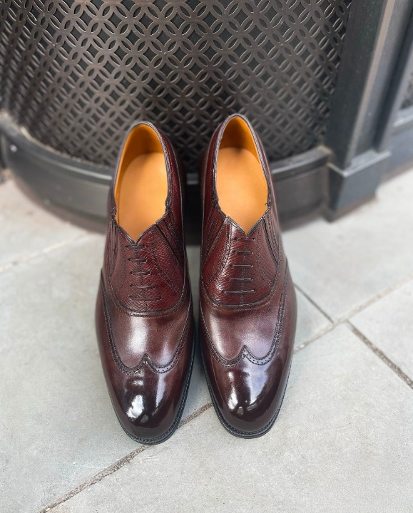 Handmade Men Burgundy Calf Grain Leather Wingtip Oxford Lace up Dress Shoes