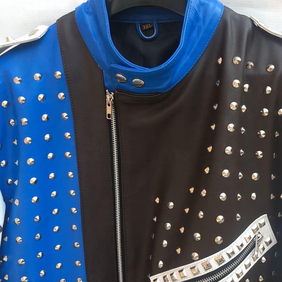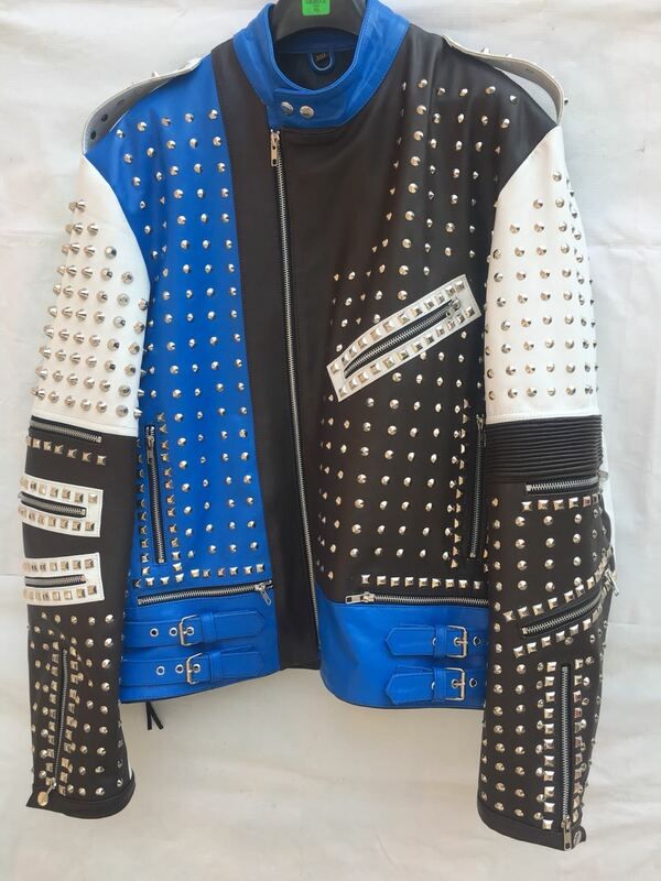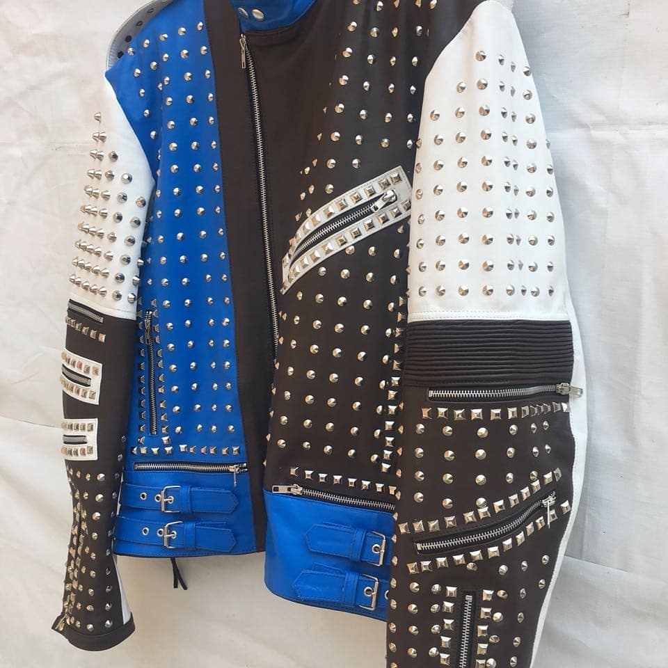 Crafted Leather Handmade Black White and Blue Studded Biker Leather Jacket Multi Color Design