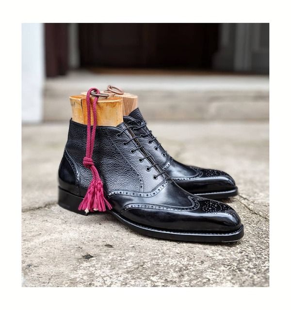 Handmade Men Black Calf Leather Ankle Wingtip Dress Balmoral Boot