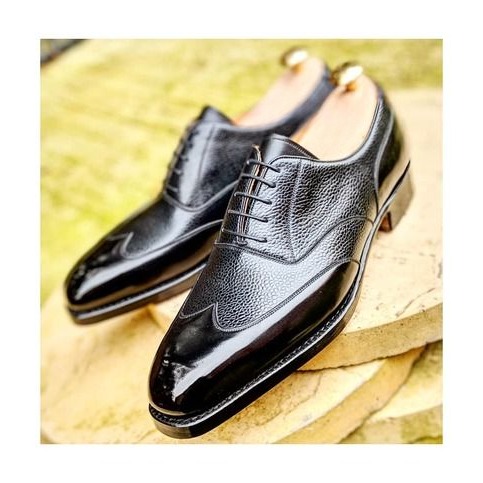 Handmade Men Black Calf Grain Leather Wingtip Oxford Lace up Dress Shoes
