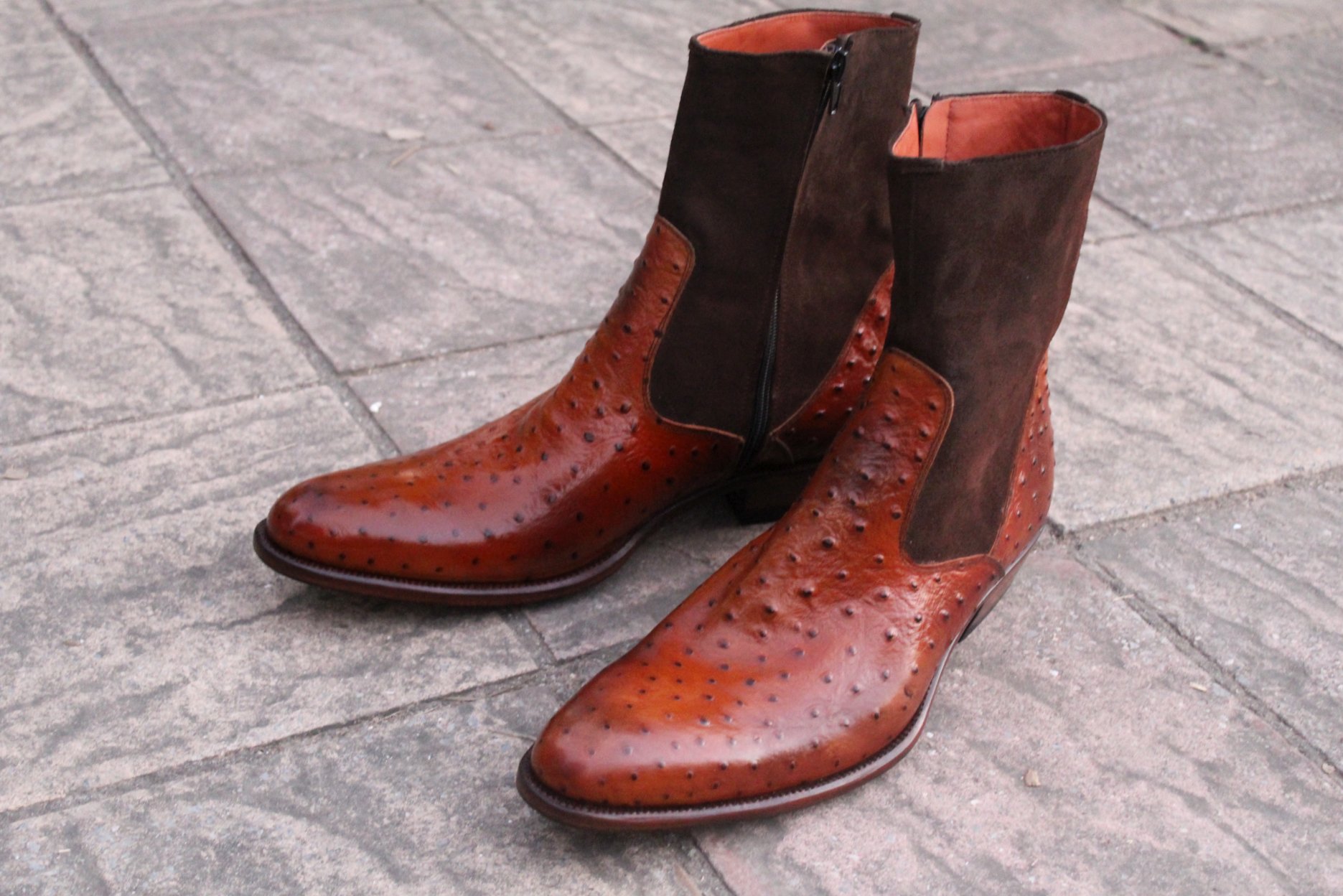 Crafted Leather Classic Brown Ostrich Suede Leather Ankle High Cowboy Boot
