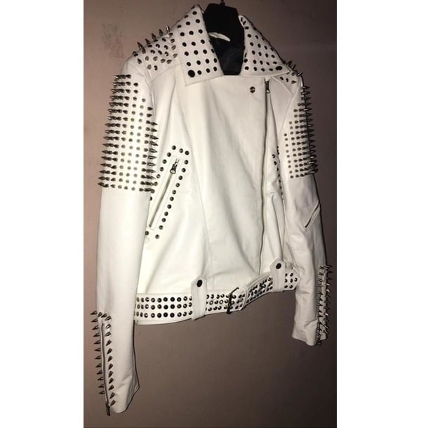 Crafted Leather Handmade White Color Biker Real Leather Studded Jackets For Mens