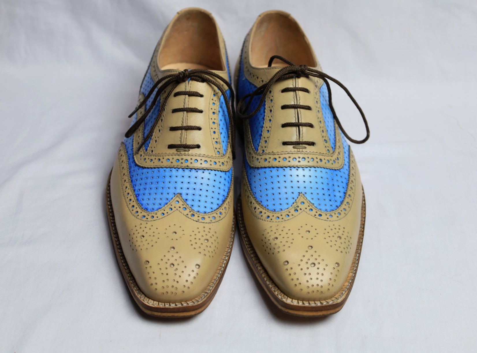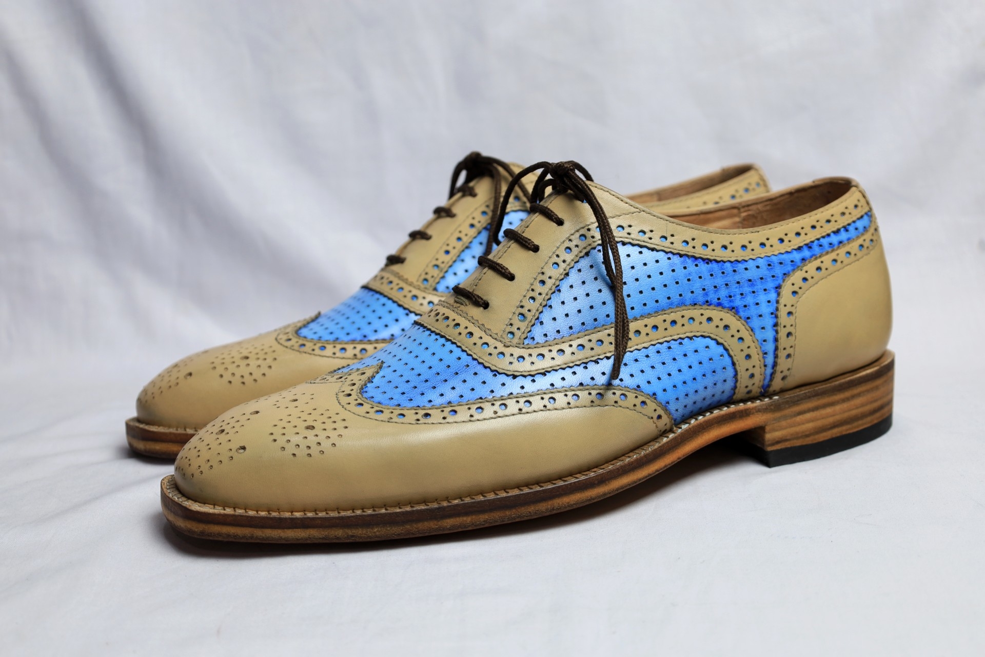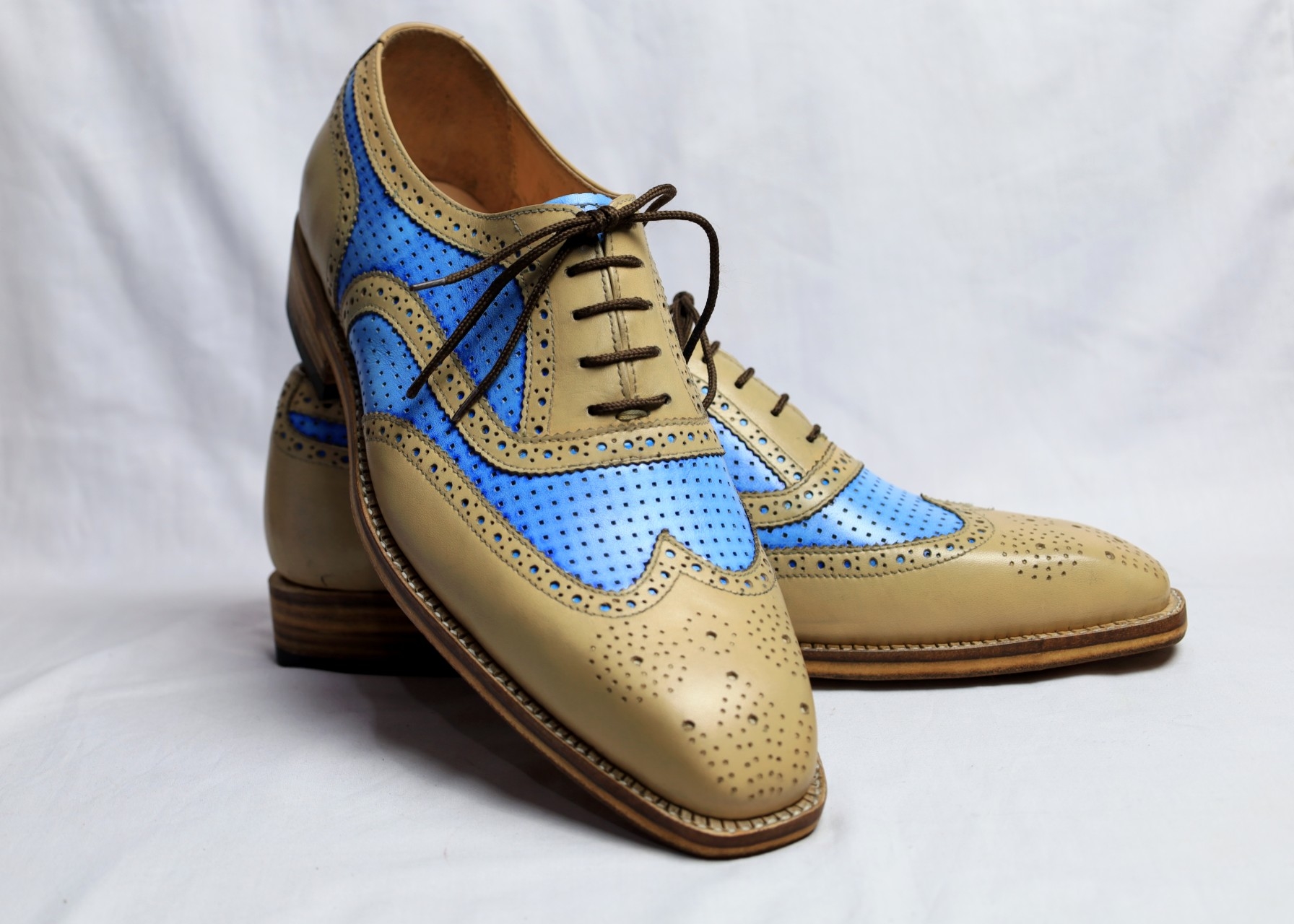 Crafted Leather Handmade Men Beige Blue Leather Lace up Oxford Dress Shoes