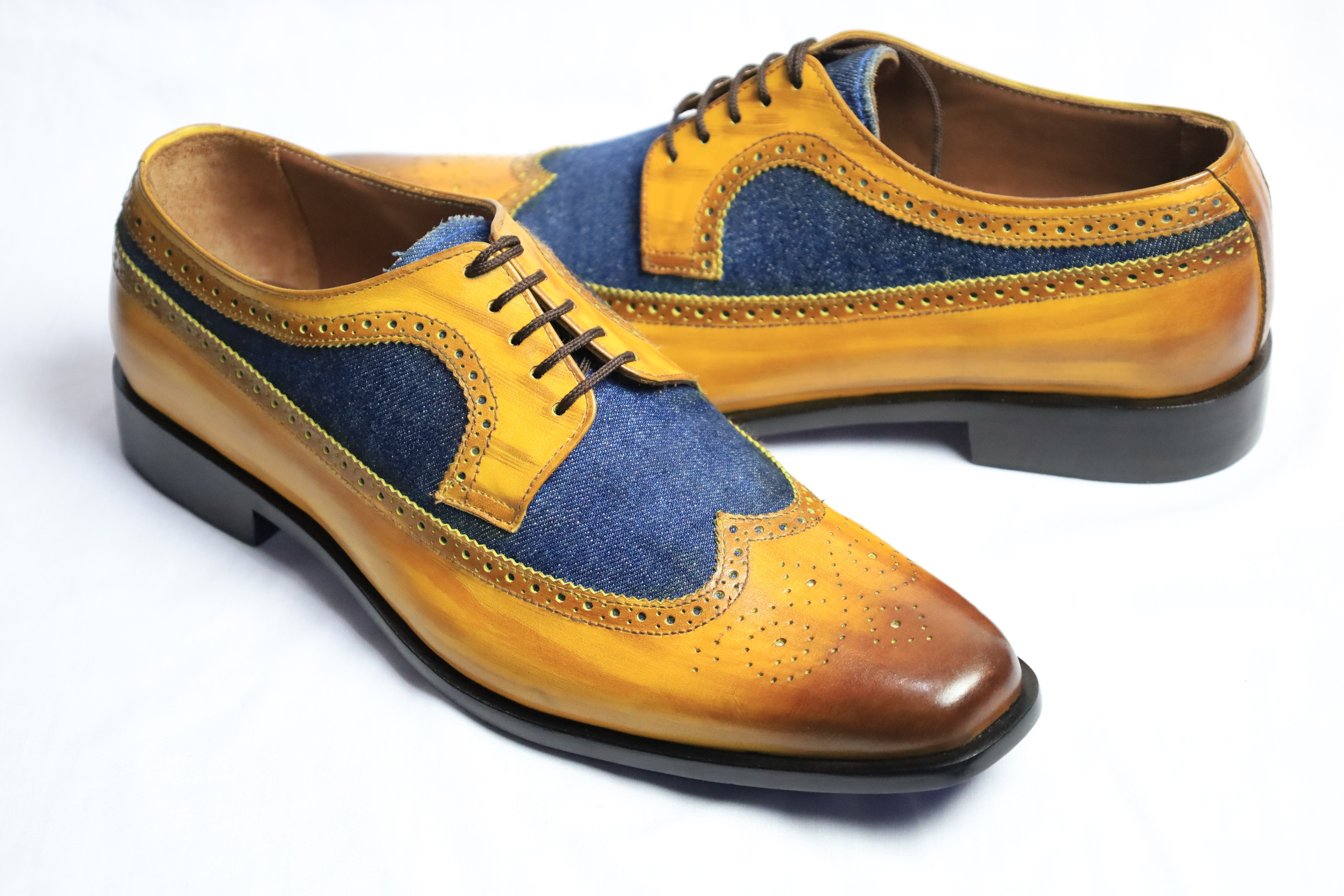 Crafted Leather Handmade Men Brown Blue Leather Wingtip Oxford Lace up Dress Shoes