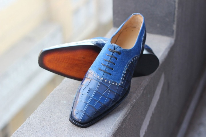 Crafted Leather Classic and Luxury Blue Suede Crocodile/Alligator Oxford Lace up Dress Shoes