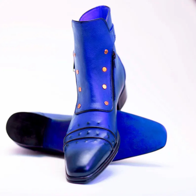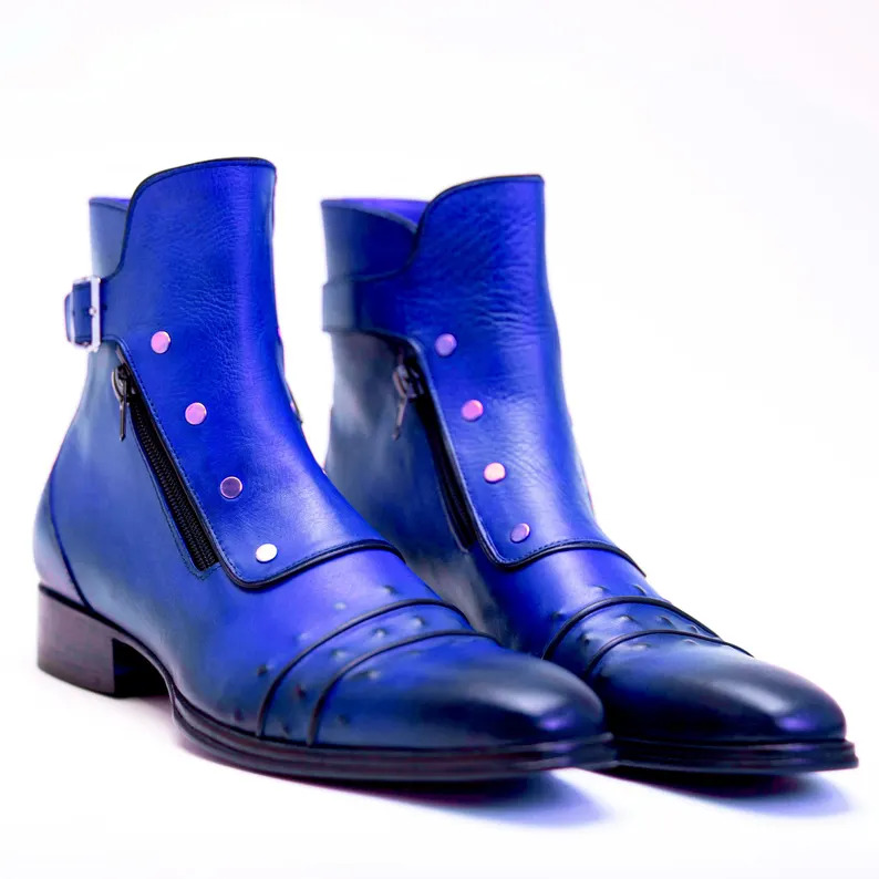 Crafted Leather Handmade Men Classic Blue Leather Jodhpur Boot with Zipper and Button