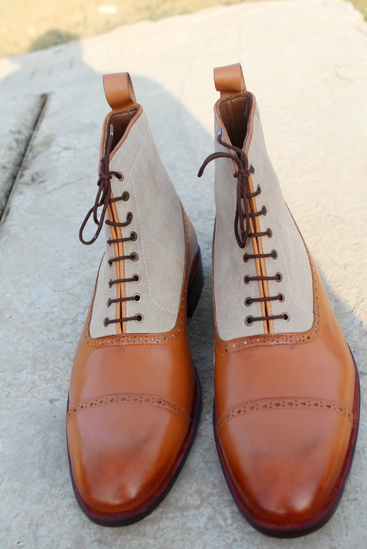 Crafted Leather Handmade Brown Leather Beige Suede Ankle High Lace up Boot