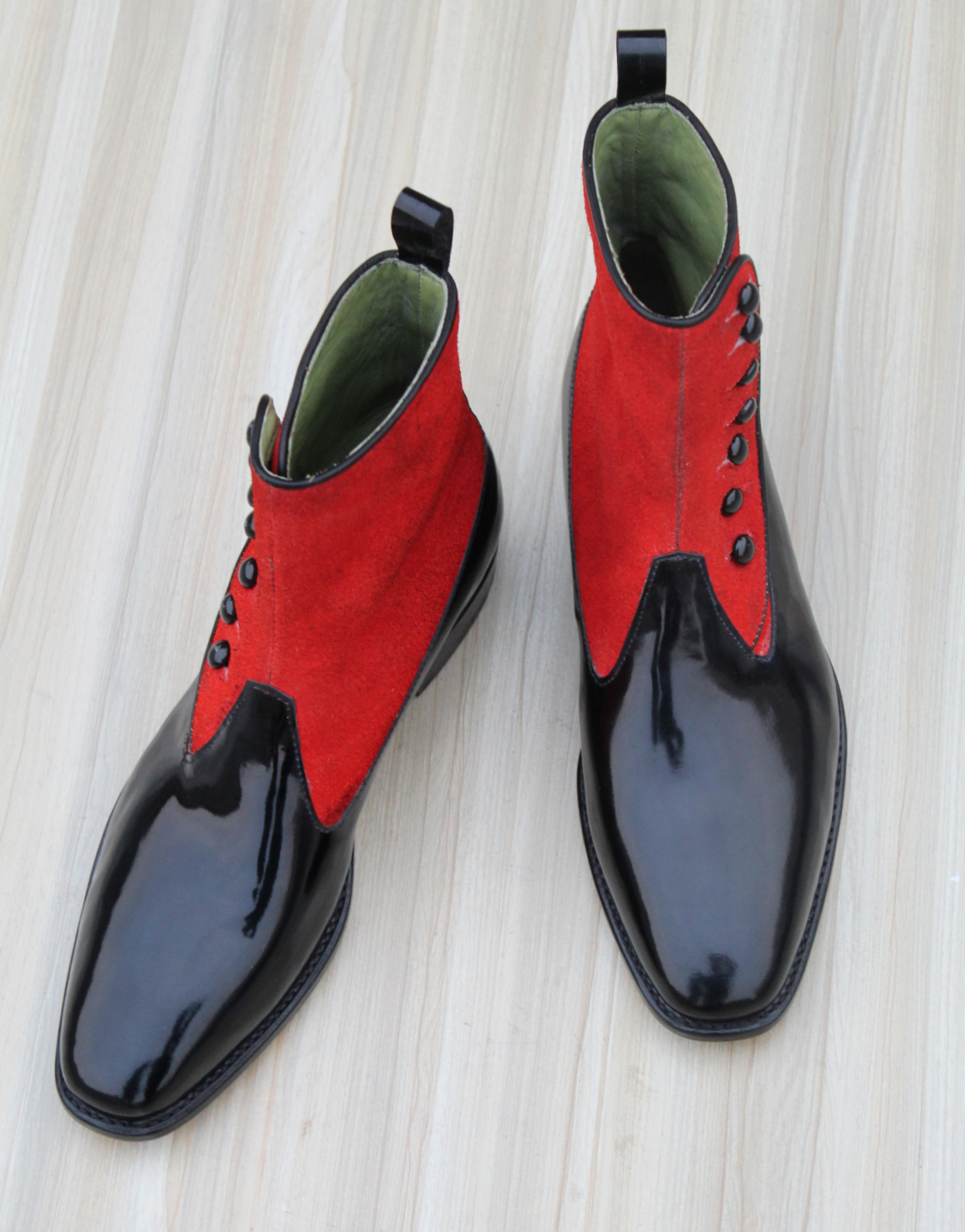 Crafted Leather Handmade Men Black Patent Red Suede Leather Ankle High Button Dress Boot