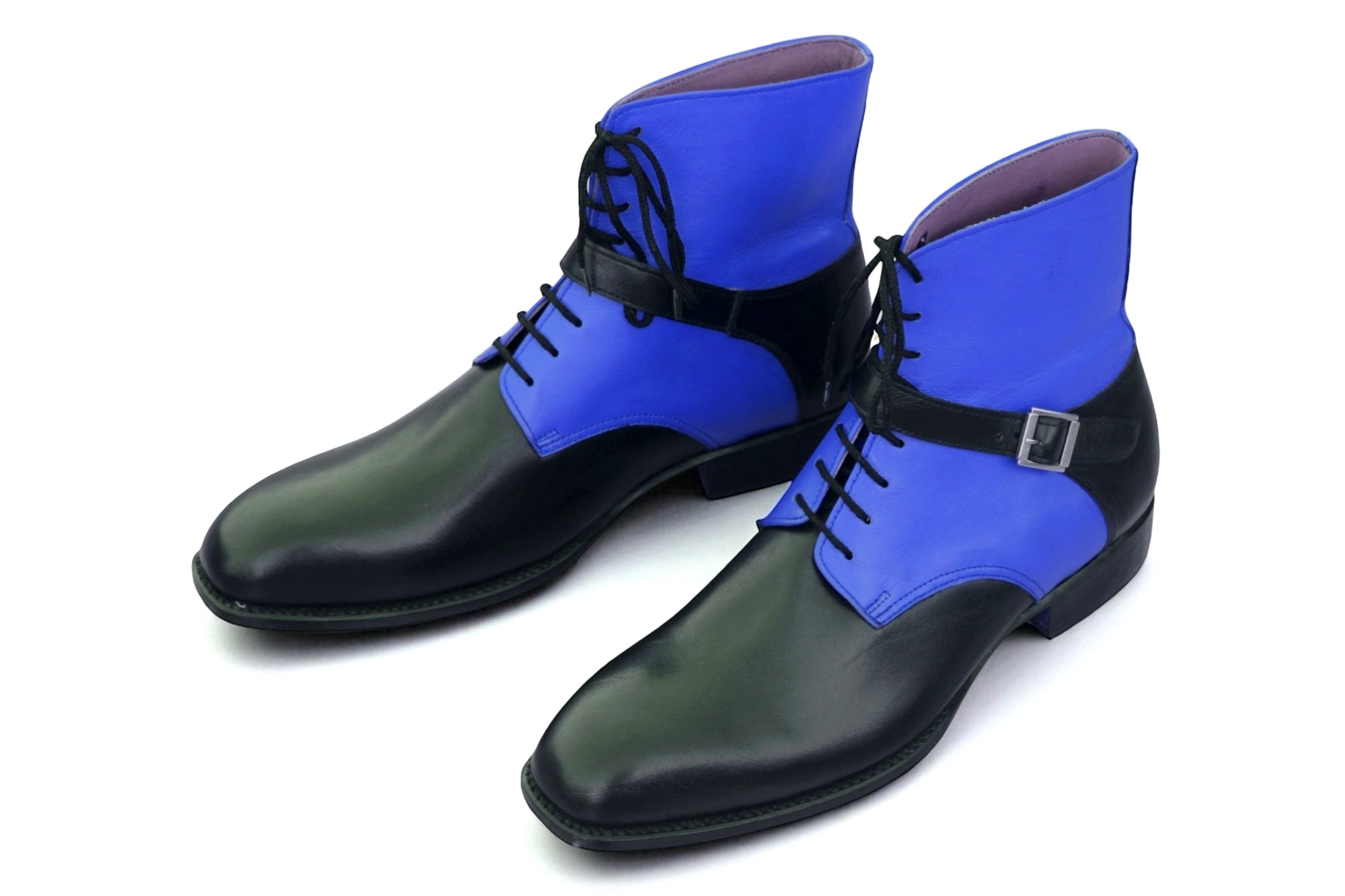 Inner: Soft Leather Sole: Leather Gender : Male Heel: Leather Color: Blue / Black Style: Ankle High Lace up Strap Boot Lining Soft Calf Leather Lining Totally Hand stitched Manufacturing time 7-10 business days If you can’t find your Size/Colorjust send us message we will make for you.