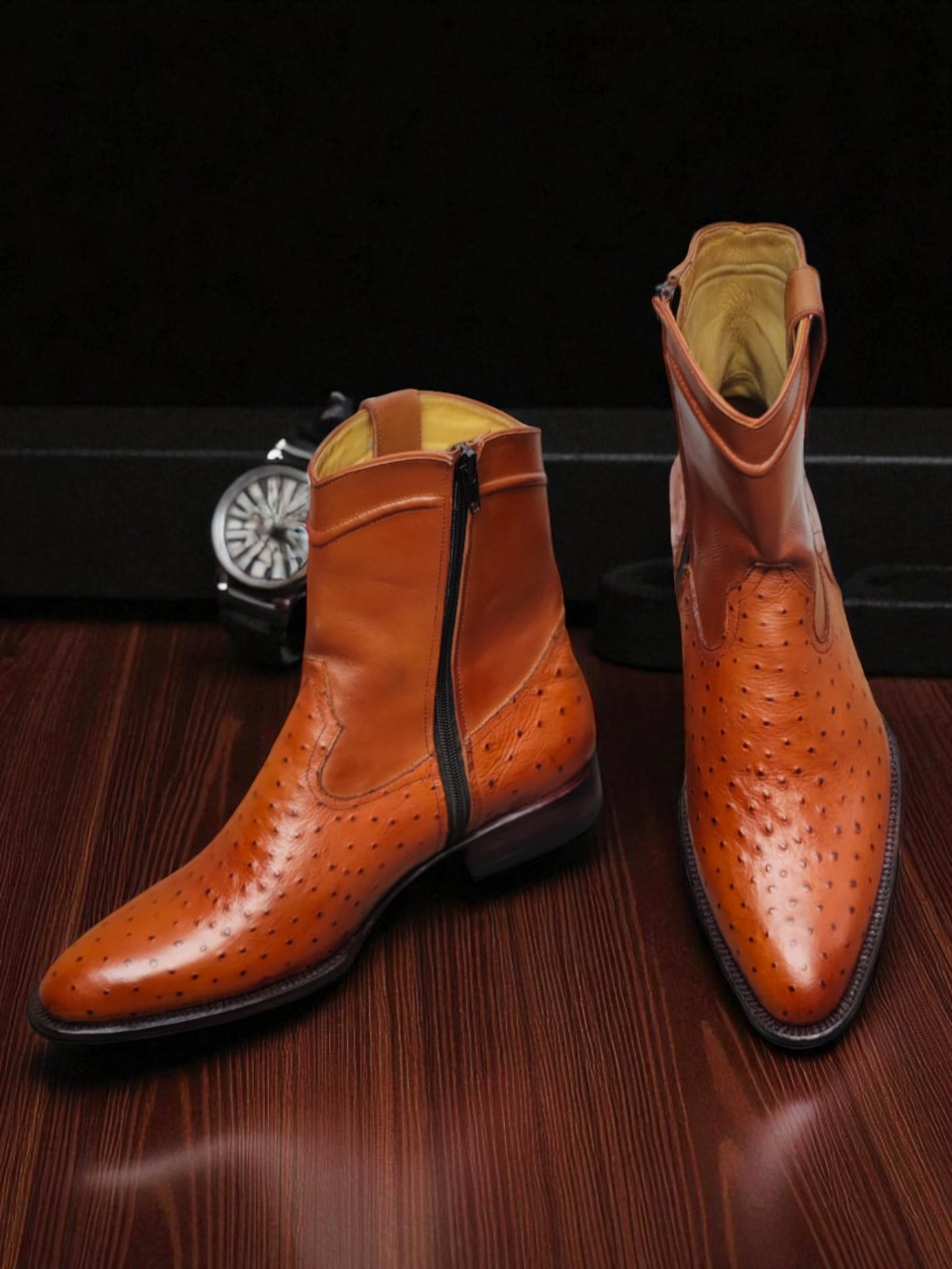 Crafted Leather Classic Brown Ostrich Leather Side Zipper Cowboy Boot
