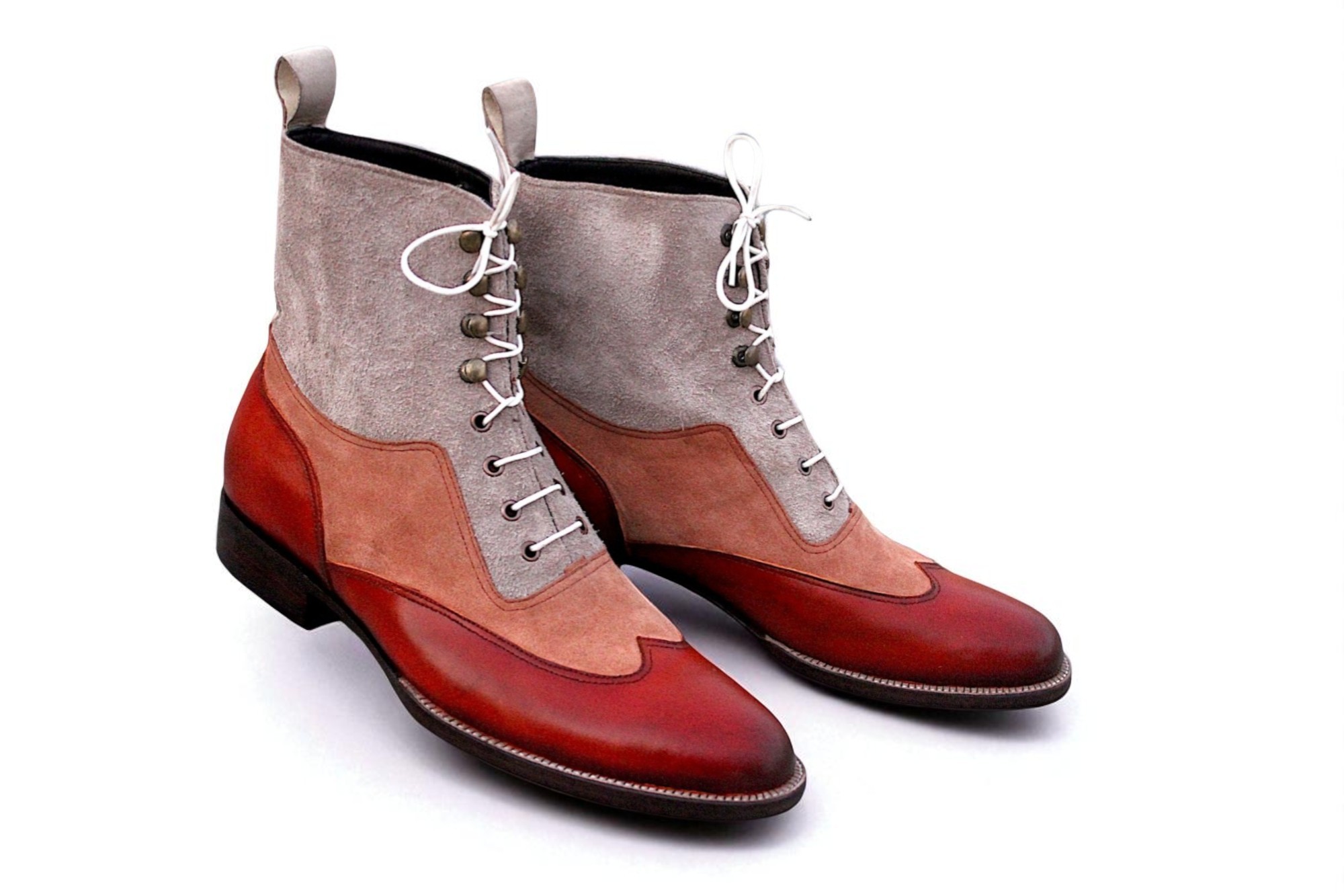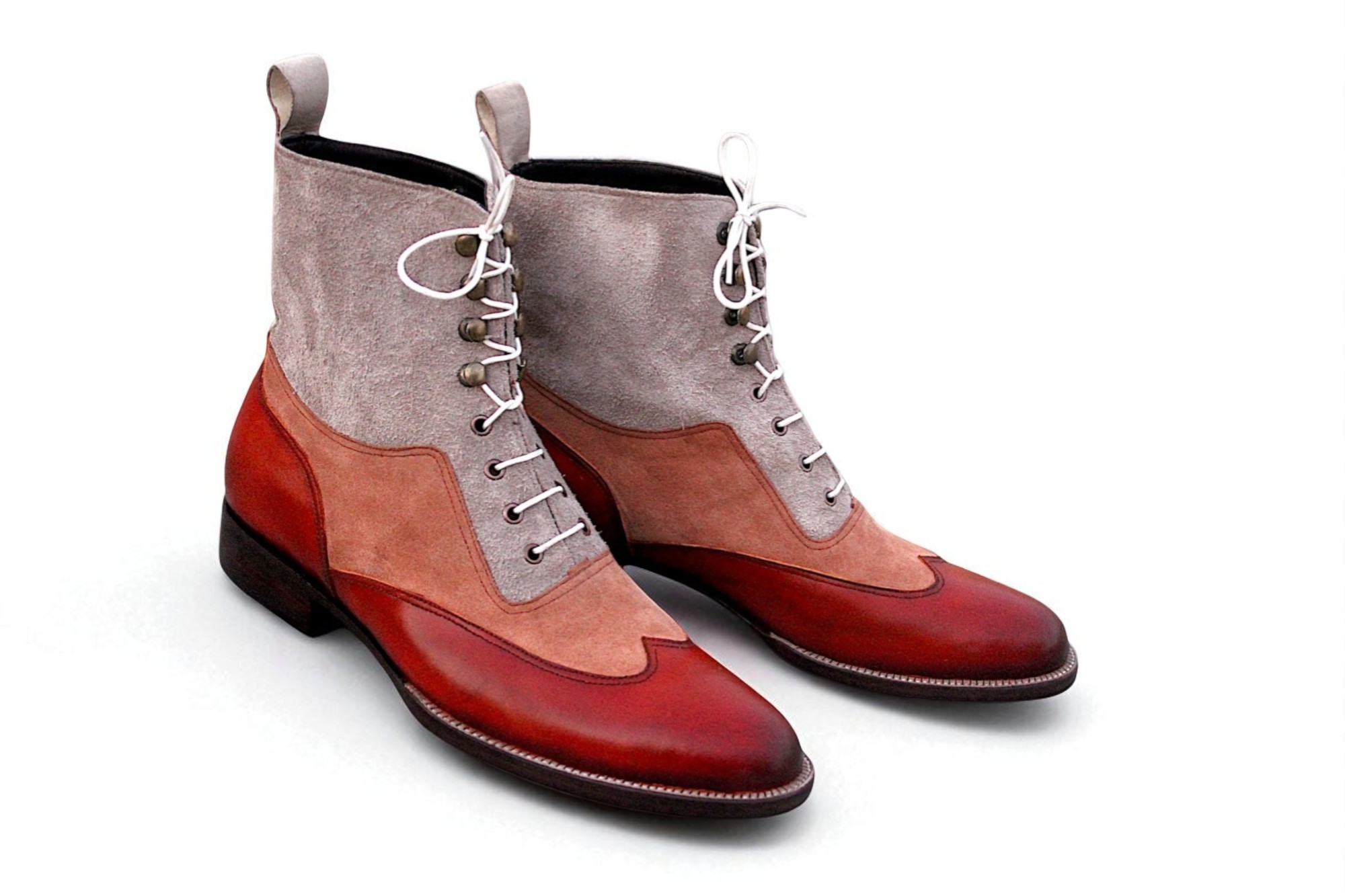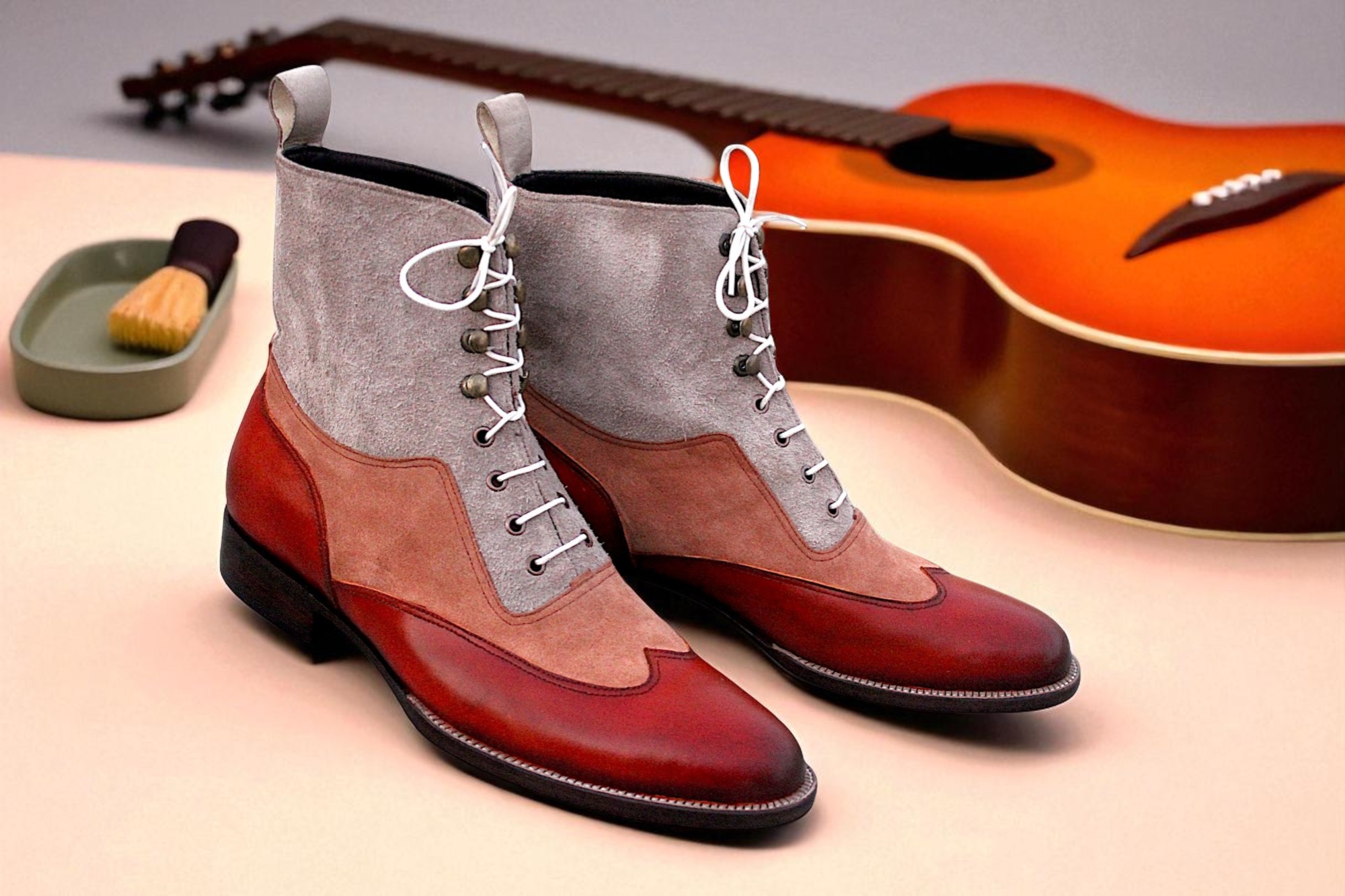 Crafted Leather Men Classic Tri Tone Leather and Suede Wingtip Ankle High Balmoral Dress Boot