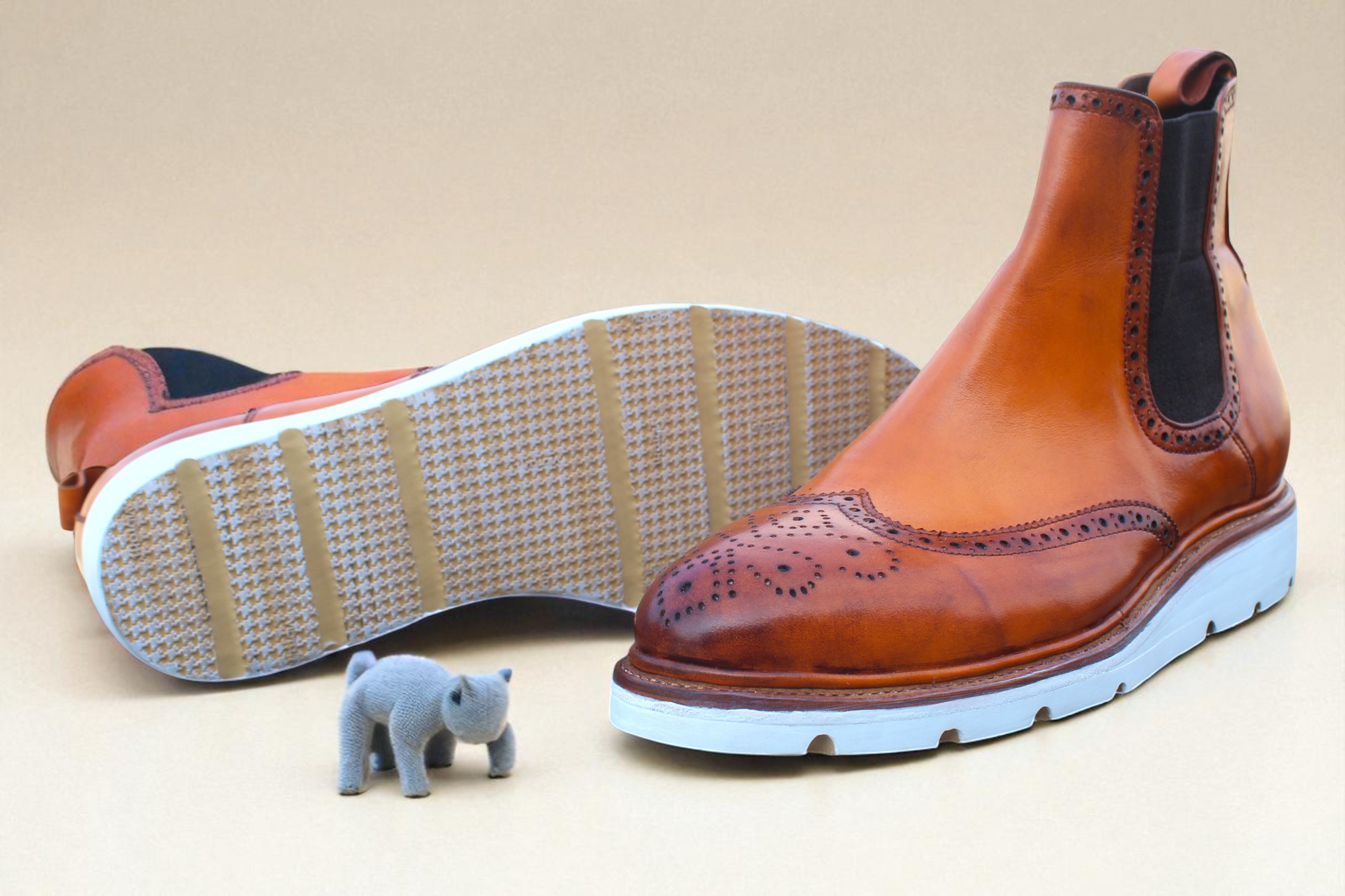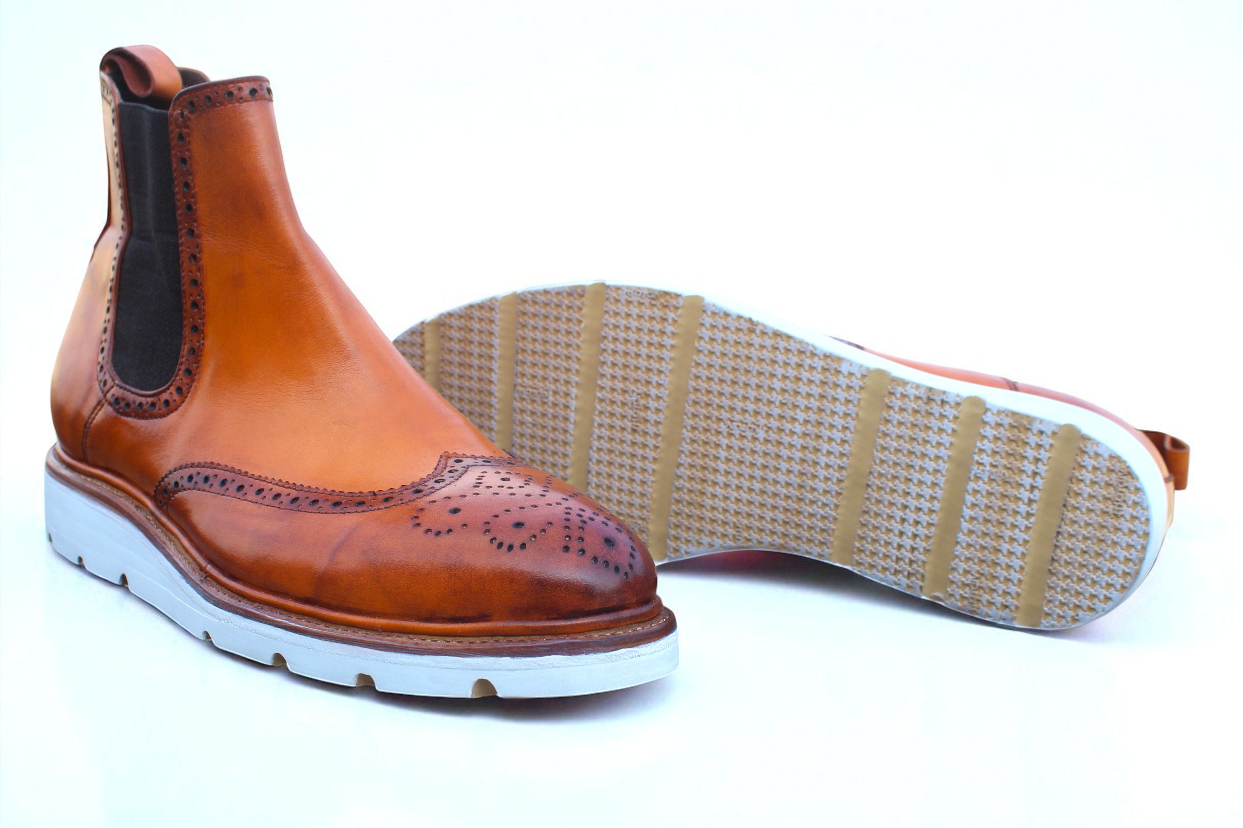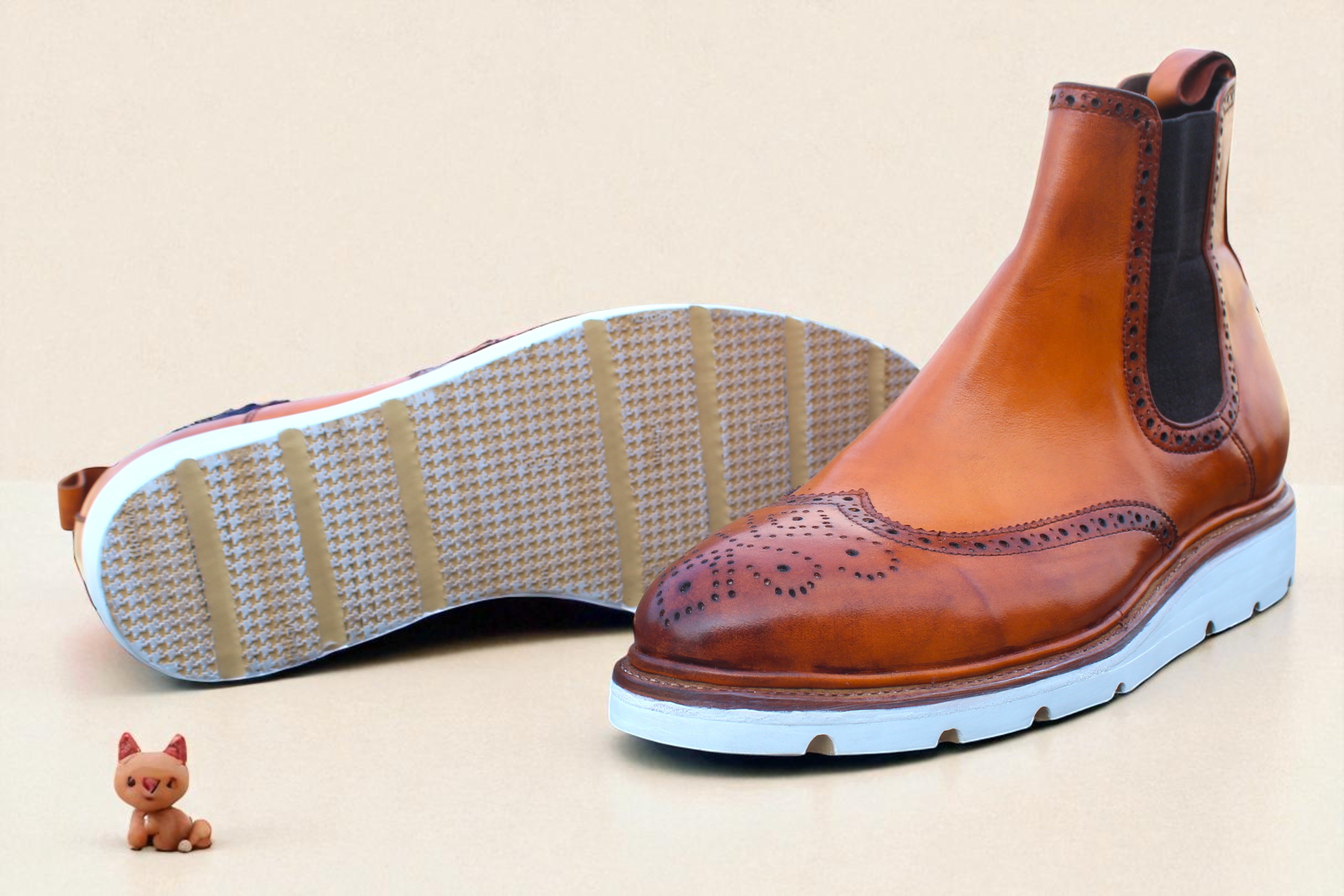Inner: Soft Leather Sole: Rubber Sole Gender : Male Heel: Leather Color: Tan Style: Chelsea Boot Totally Hand stitched Manufacturing time 7-10 business days If you can’t find your Size/Color just send us message we will make for you.