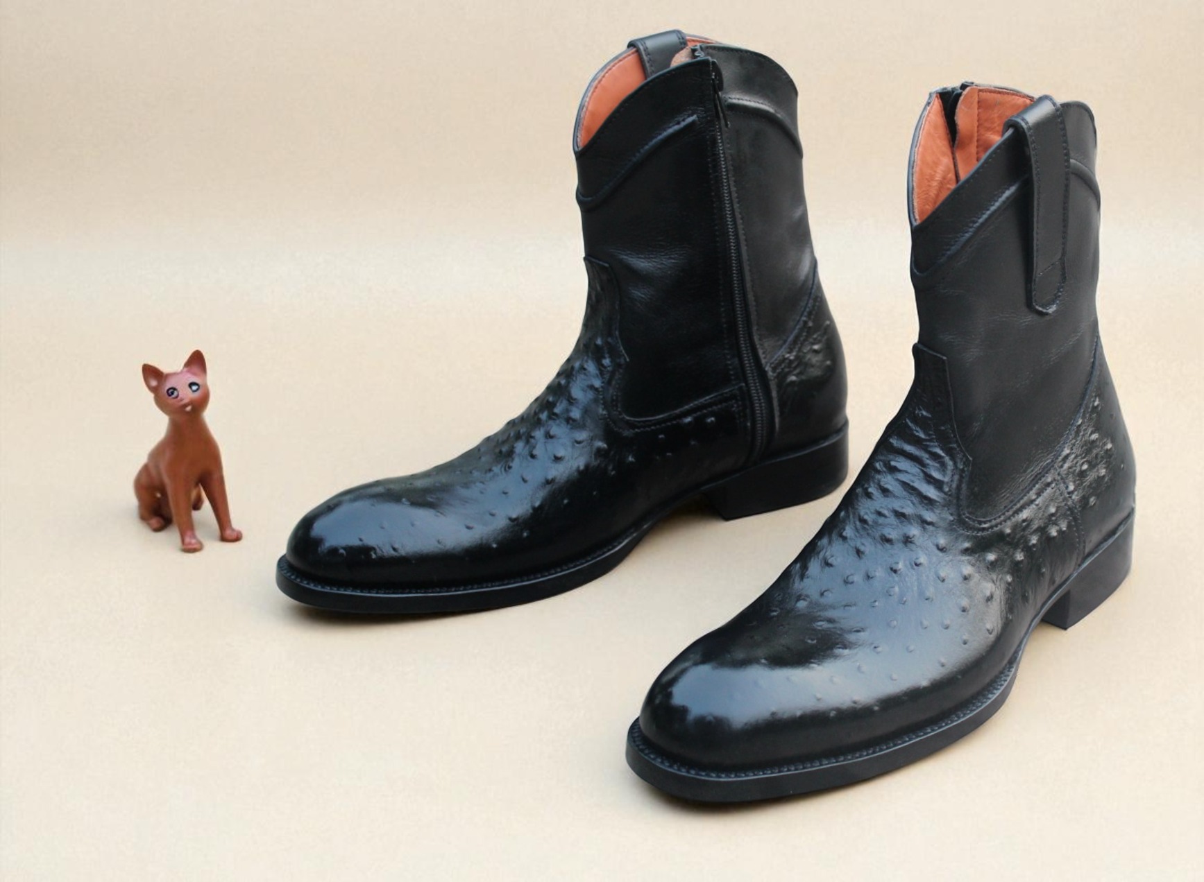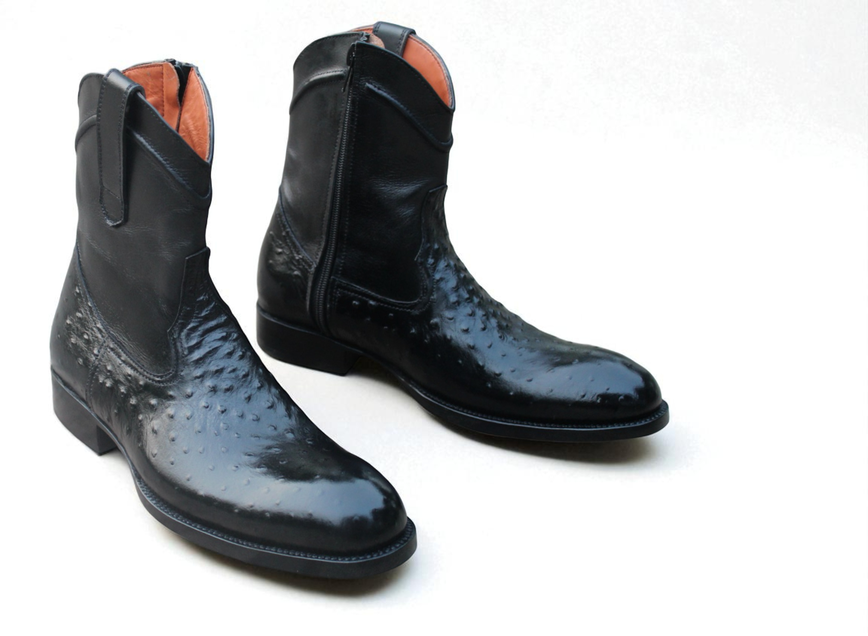 Crafted Leather Handmade Men Classic Black Ostrich Leather Cowboy Boot