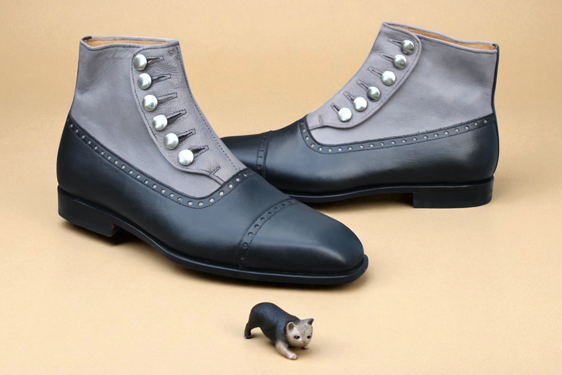 Inner: Soft Leather Sole: Leather Gender : Male Heel: Leather Color: Black / Gray Style: Ankle High Button Boot Lining Soft Calf Leather Lining Totally Hand stitched Manufacturing time 7-10 business days If you can’t find your Size/Colorjust send us message we will make for you.