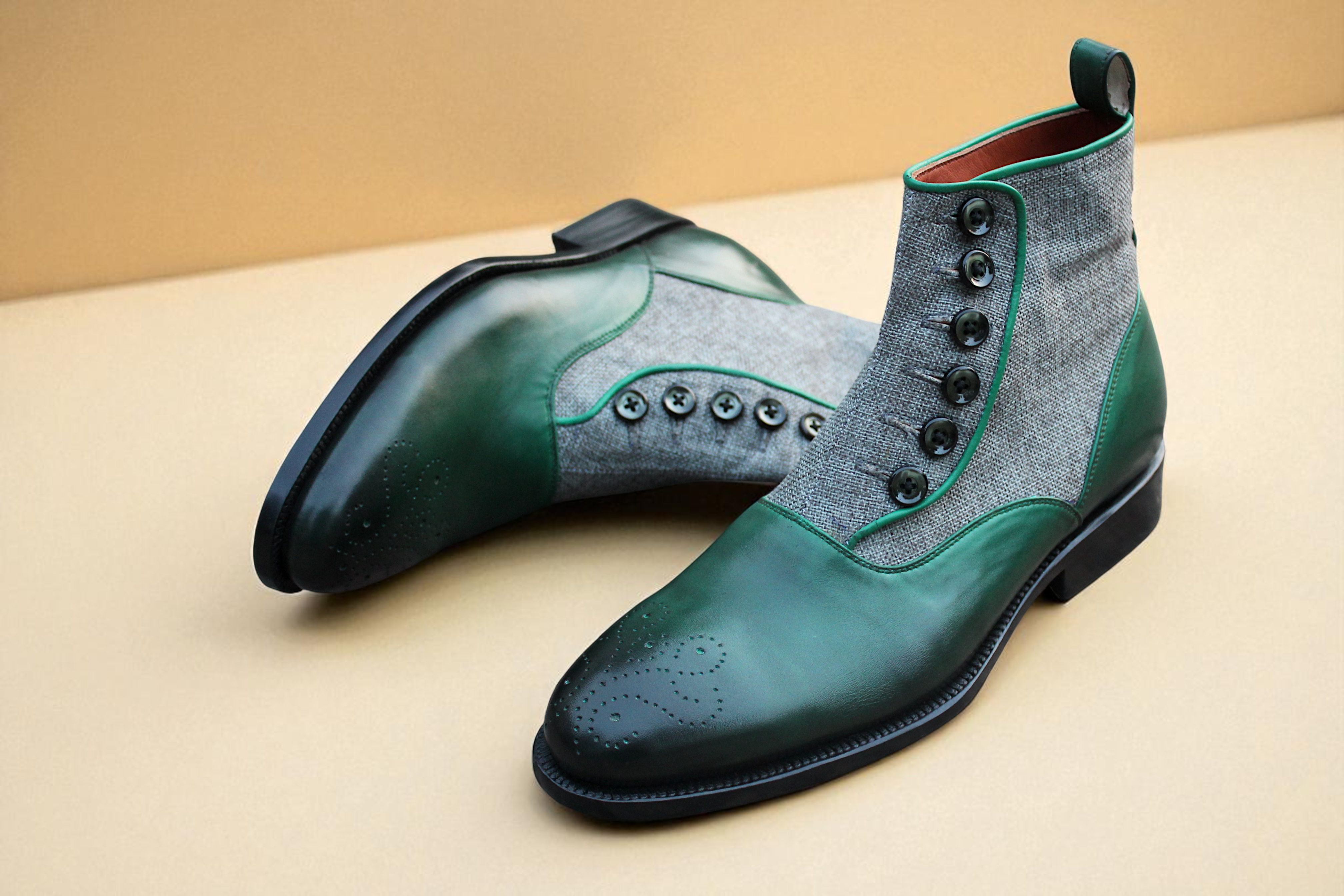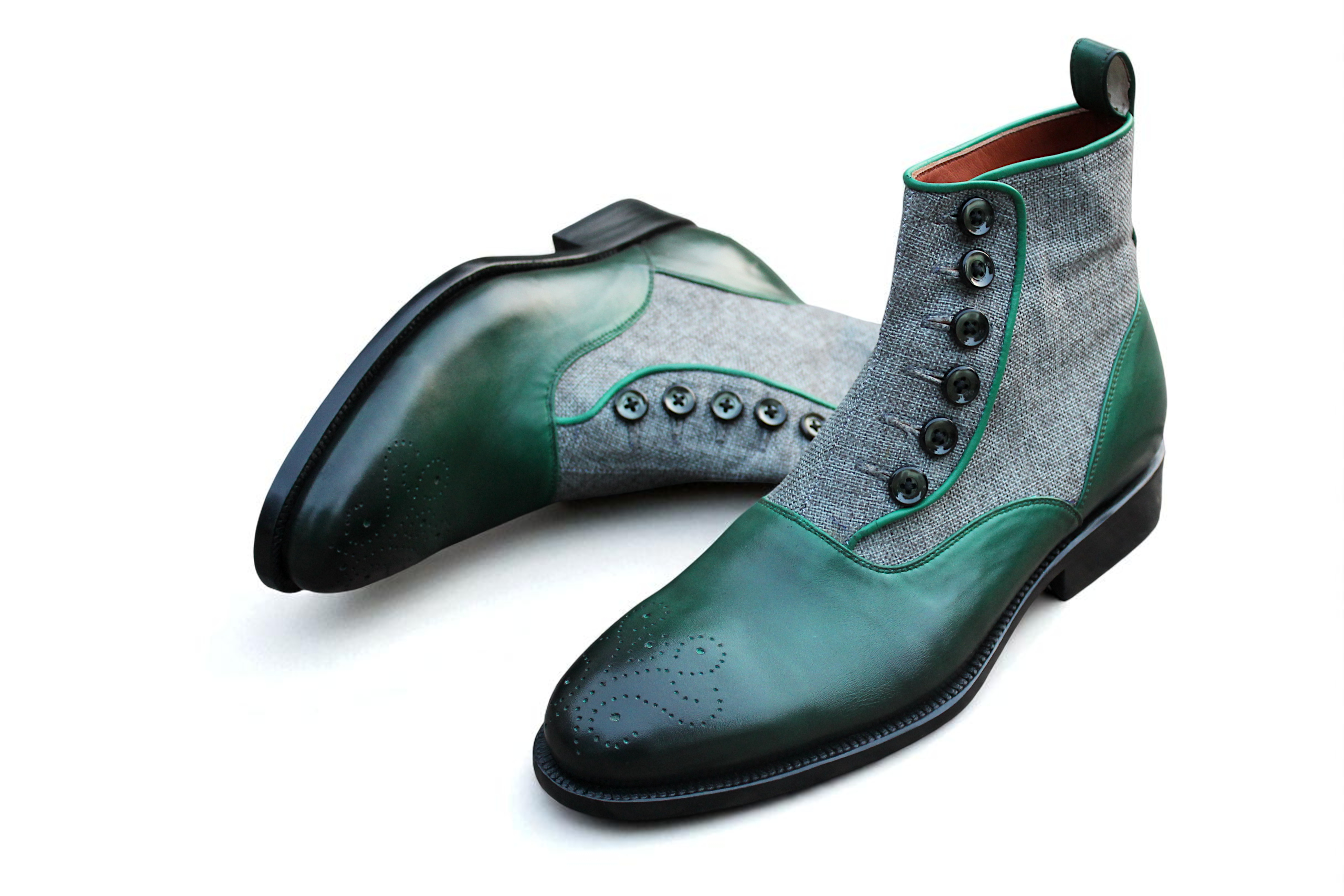 Crafted Leather Classic Green Leather and Tweed Contrast Ankle High Button Boot