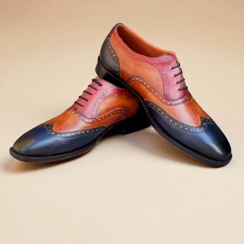Crafted Leather Classic Men Brown Blue Leather Wingtip Oxford Dress Shoes