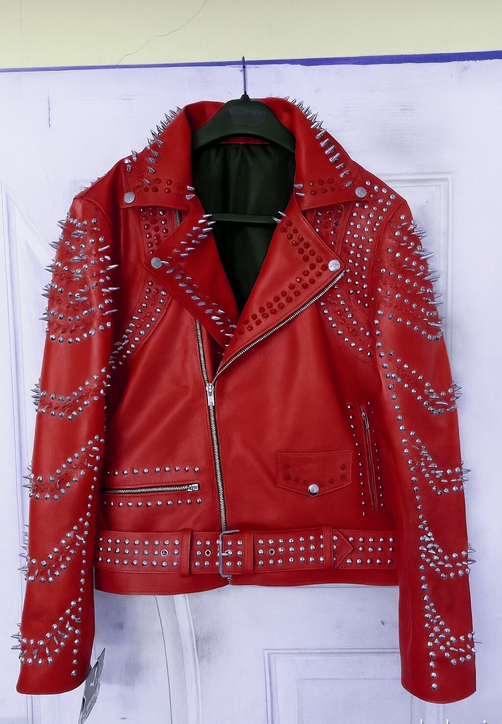 Crafted Leather New Women Punk Red Silver Long Spiked Studded Brando Biker Leather Jacket