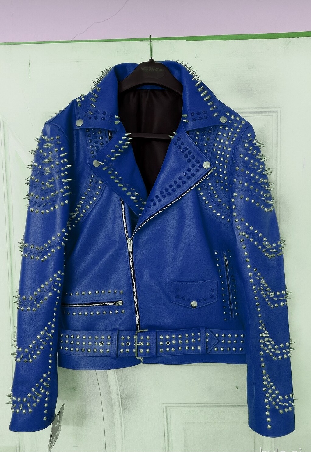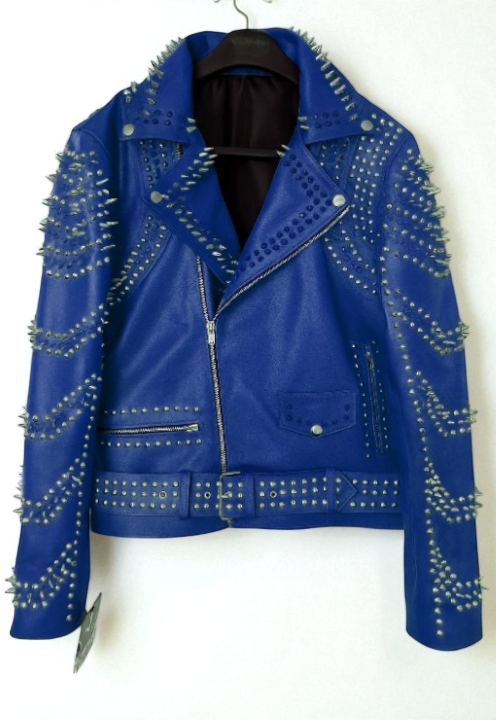 Crafted Leather New Women Punk Blue Silver Long Spiked Studded Brando Biker Leather Jacket