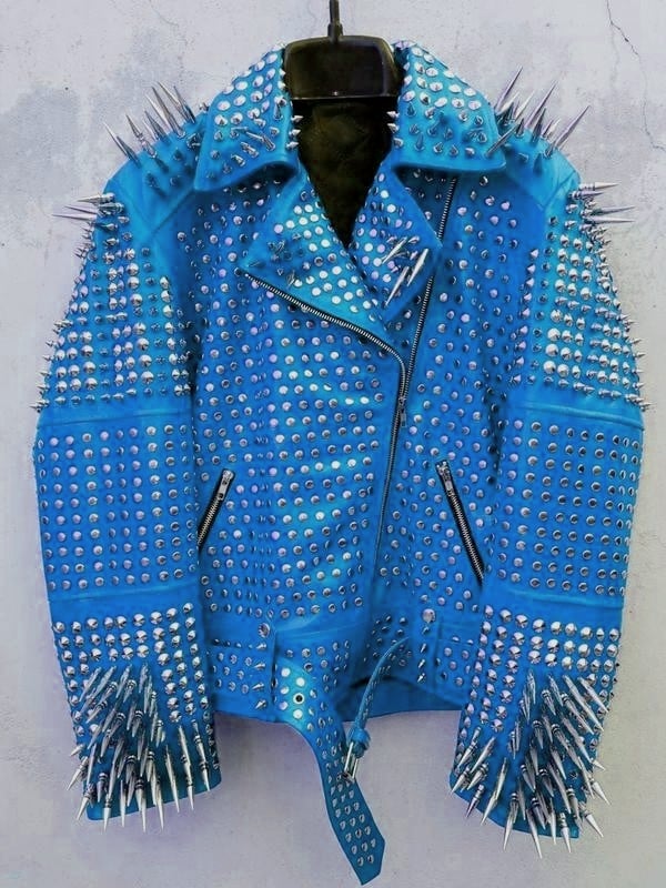 Crafted Leather Men Classy Blue Gothic Emo Style Leather Studded Jacket with Silver Studs and Spikes