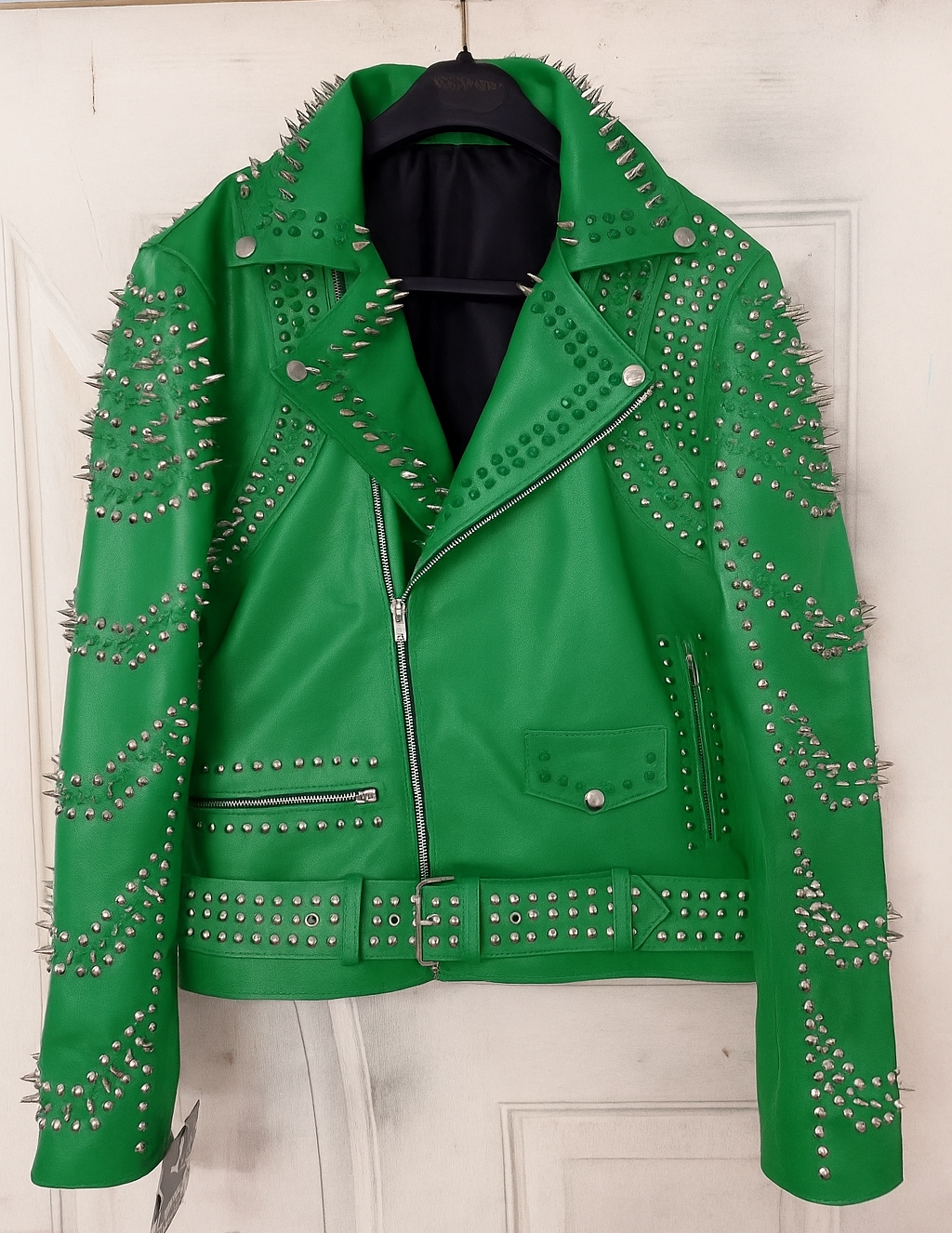Crafted Leather New Women Punk Green Silver Long Spiked Studded Brando Biker Leather Jacket