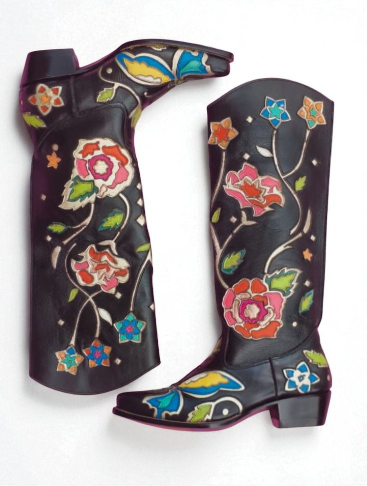 Crafted Leather Classic Women Black Leather Fancy Cowboy Boot