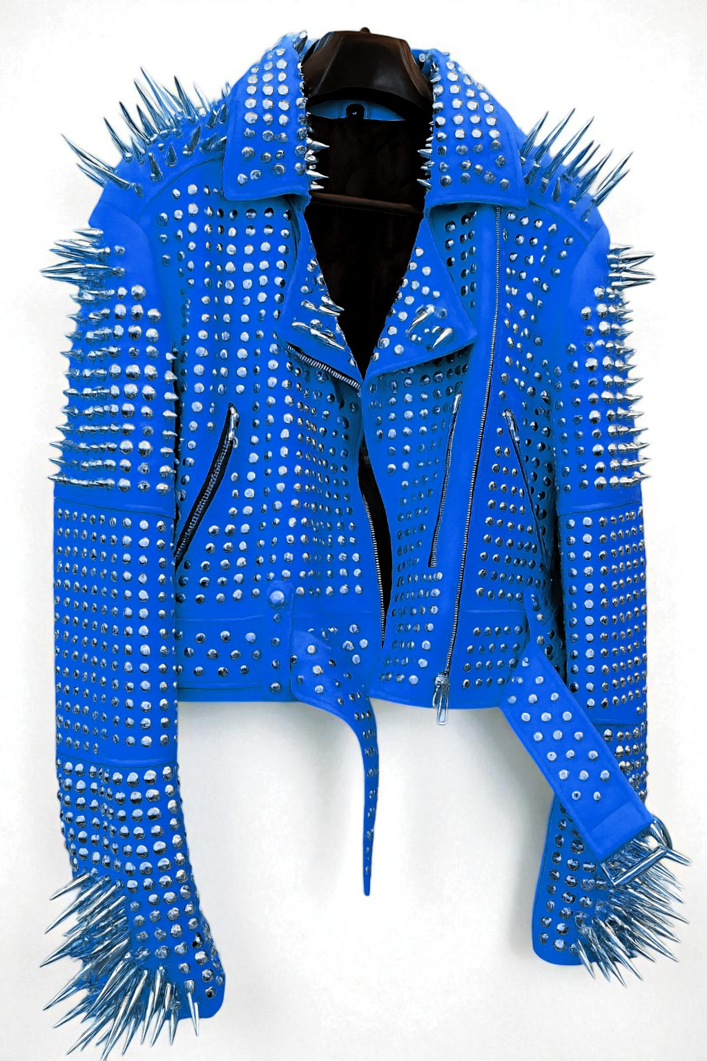 Crafted Leather New Classic Awesome Handmade Women's Blue Color Studded Brando Metal Spiked Leather Round Studs Jacket