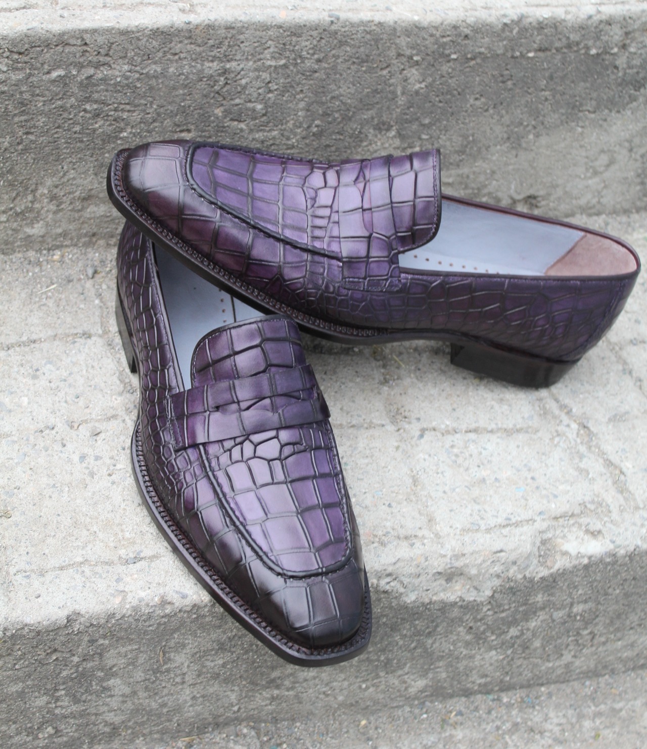 Crafted Leather Bespoke Men Dress Shoes Purple Crocodile Alligator Leather Moccasin Loafers