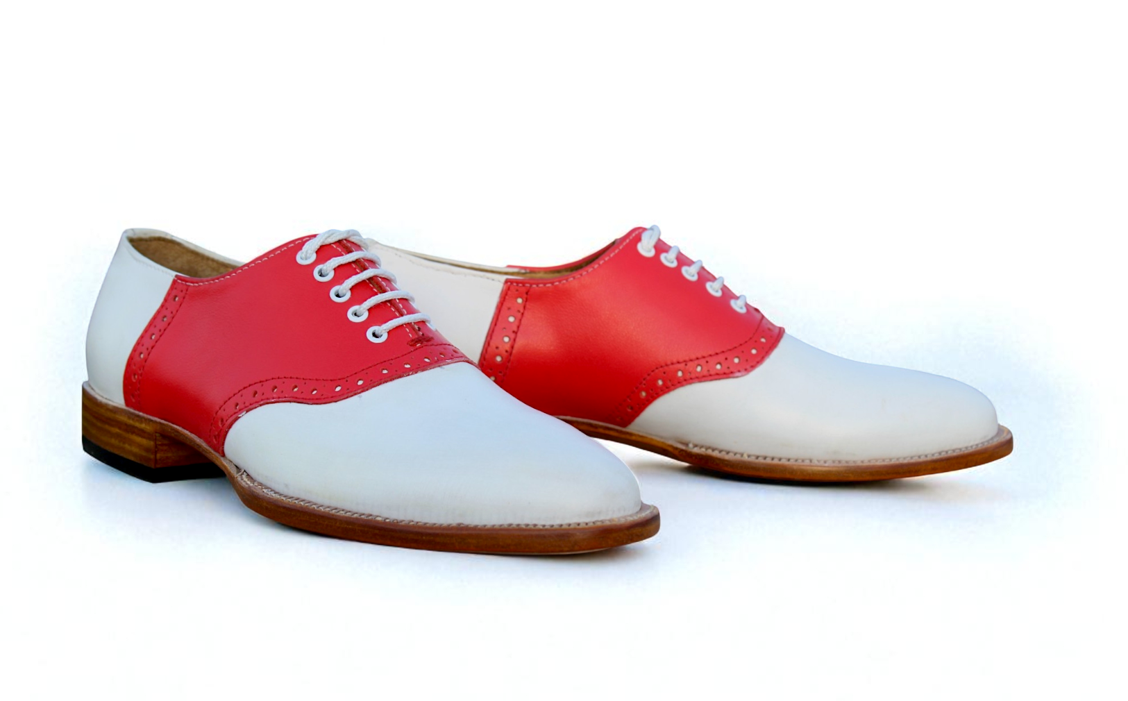 Crafted Leather Handmade Men Two Tone Lace up Red White Leather Saddle Golf Shoes