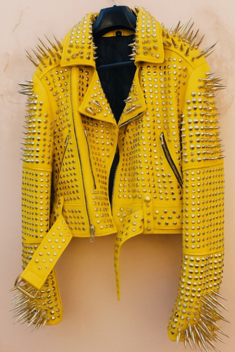 Crafted Leather New Classic Awesome Handmade Women's Yellow Color Studded Brando Metal Spiked Leather Round Studs Jacket