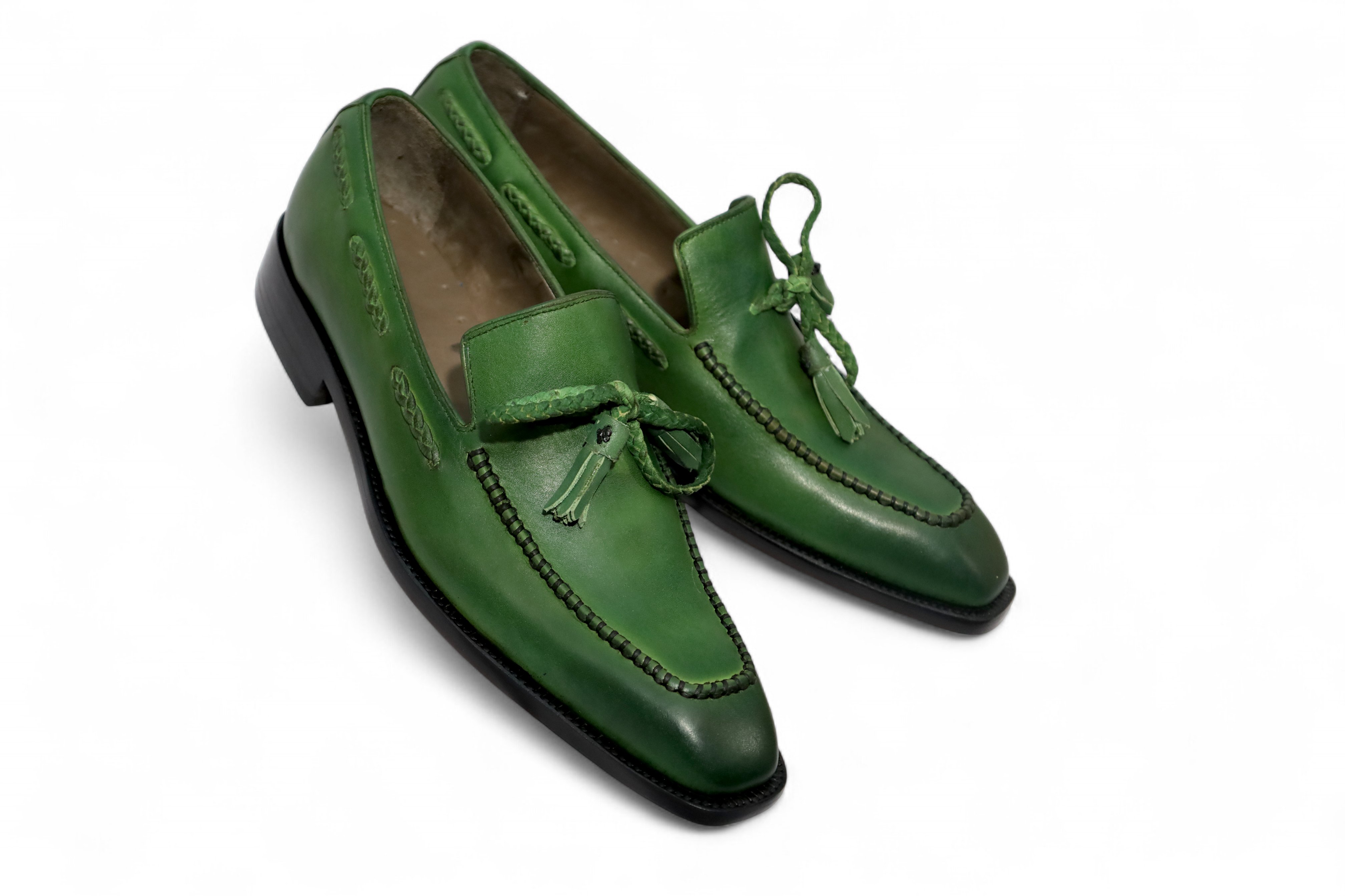 Inner: Soft Leather Sole: Leather Gender : Male Heel: Leather Color: Green Style: Tassel Loafers Dress Shoes Lining Soft Calf Leather Lining Totally Hand stitched Manufacturing time 7-10 business days If you can’t find your Size/Colorjust send us message we will make for you.
