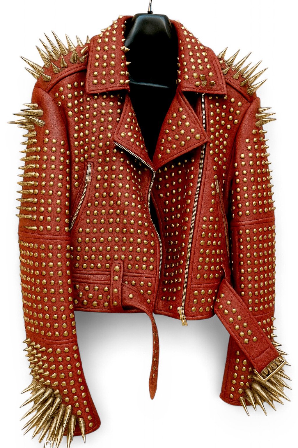 Crafted Leather New Classic Awesome Handmade Women's Maroon Studded Brando Metal Spiked Leather Round Studs Jacket