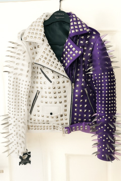 Crafted Leather New Handmade Women's Punk Full Long Spiked Studded Brando Purple Black Adorable Leather Jacket