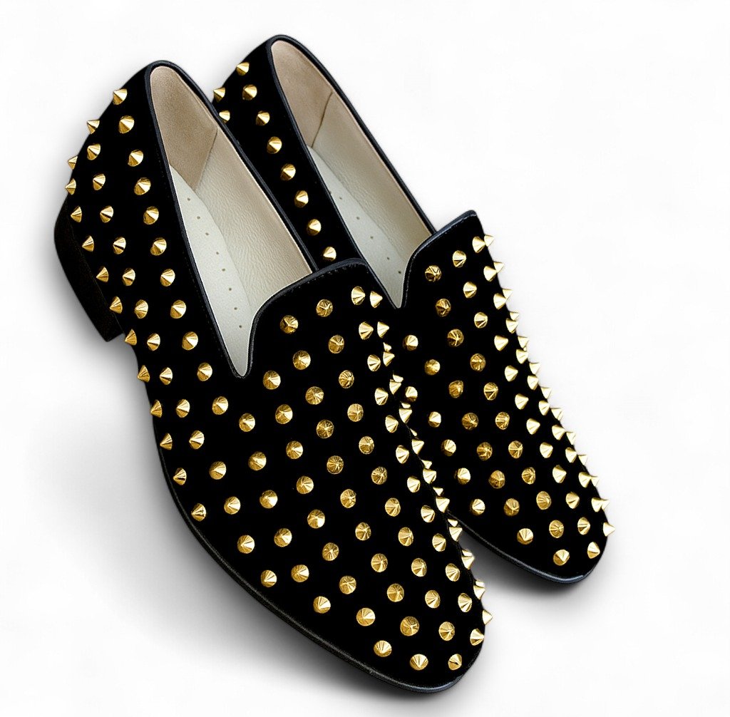 Crafted Leather Classic Black Velvet Gold Studded Loafers Shoes Prom Wedding Loafers