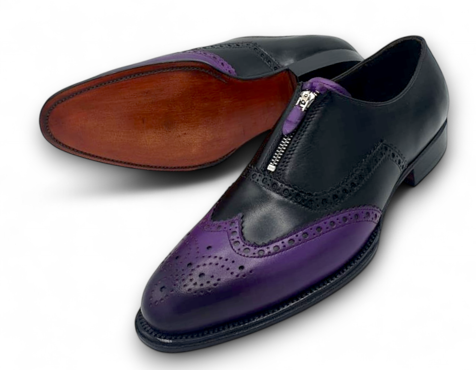 Crafted Leather Men’s Handmade Two tone Purple and black leather lace up Oxford brogues front zip style shoe