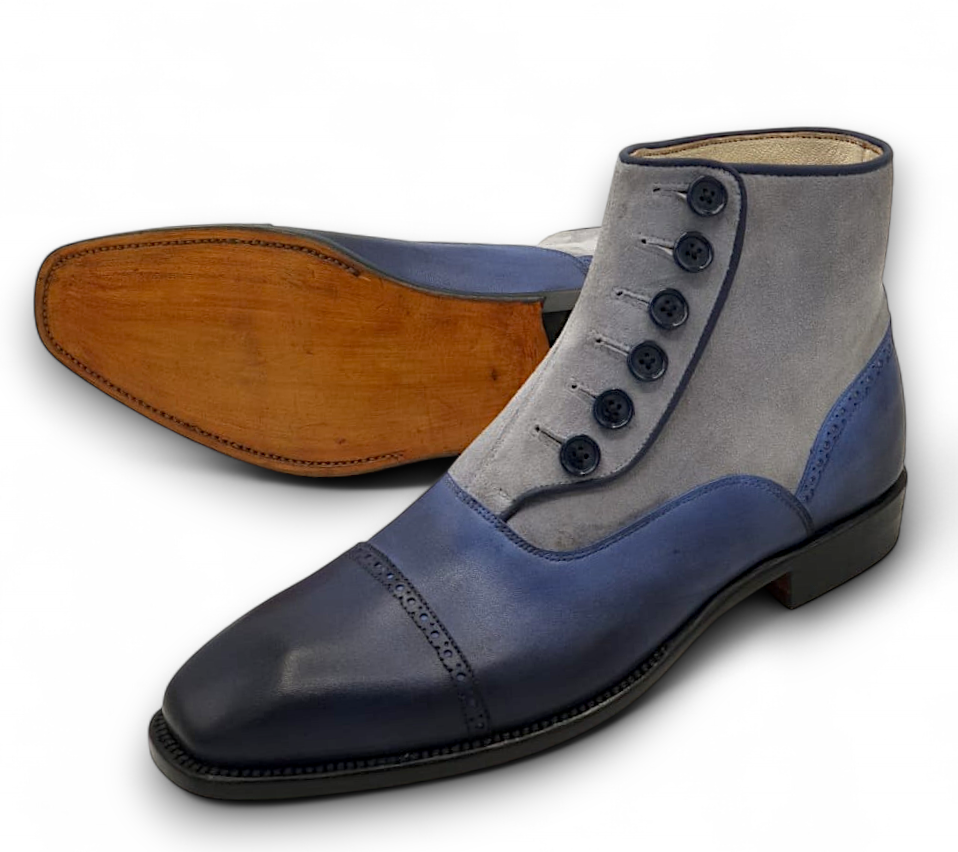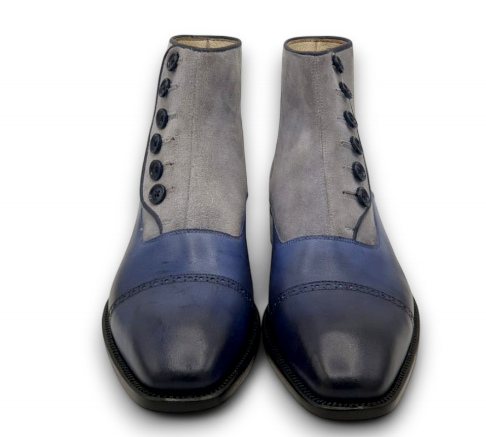 Inner: Soft Leather Sole: Leather Gender : Male Heel: Leather Color: Blue / Gray Style: Ankle High Button Boot Lining Soft Calf Leather Lining Totally Hand stitched Manufacturing time 7-10 business days If you can’t find your Size/Colorjust send us message we will make for you.