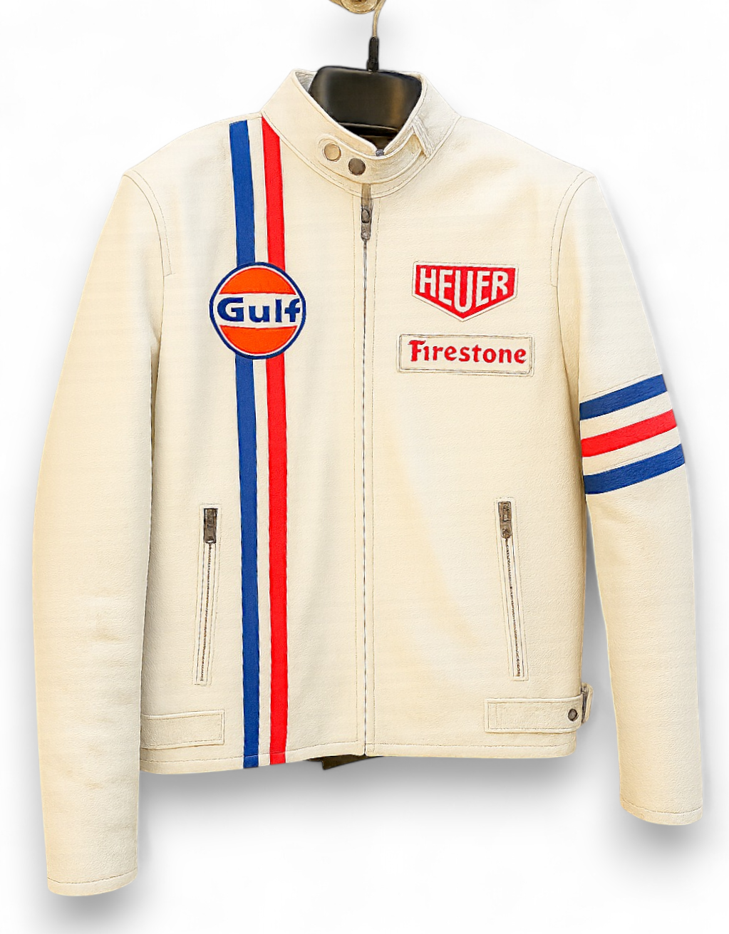 Crafted Leather Classic White Leather with Red and Blue Stripes Biker Motorcycle Jacket