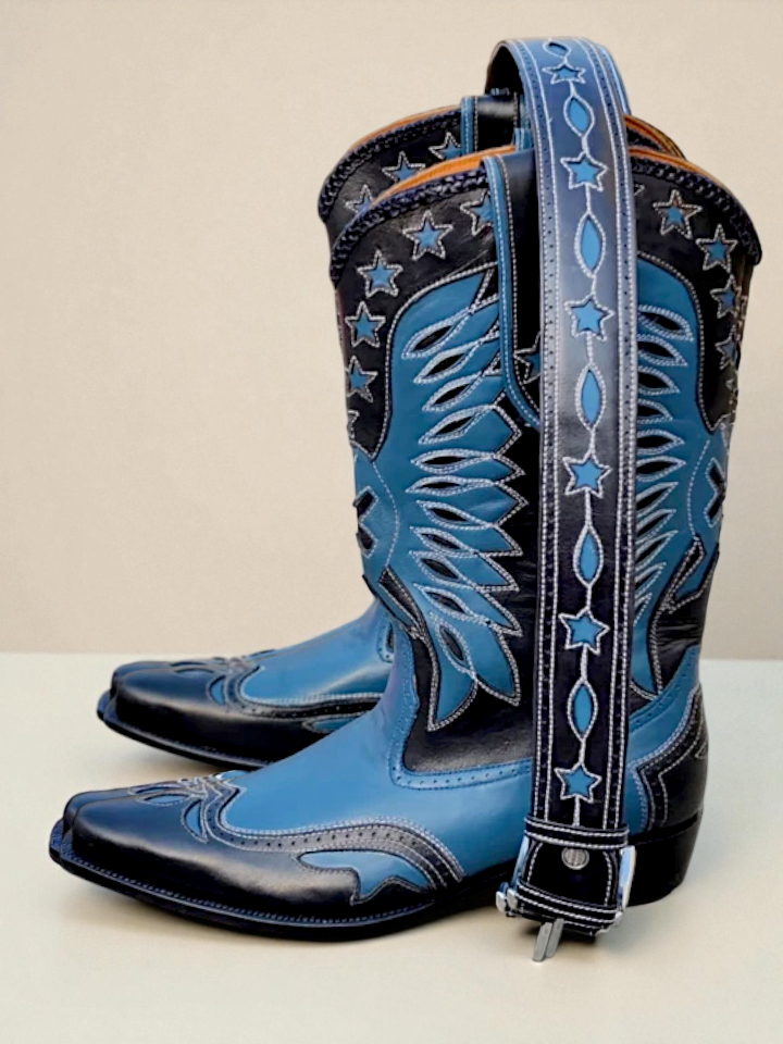 Inner: Soft Leather Sole: Leather Gender : Male Heel: Leather Color: Blue Black Style: Cowboy Boot Totally Hand stitched Manufacturing time 7-10 business days If you can’t find your Size/Colorjust send us message we will make for you.
