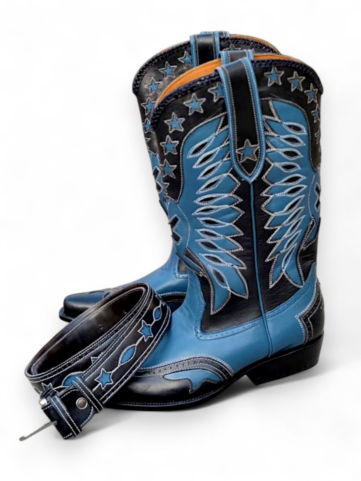 Crafted Leather New Classic Blue Black Dress Shoes Men Designer Cowboy Fashion Boot with Matching Belt