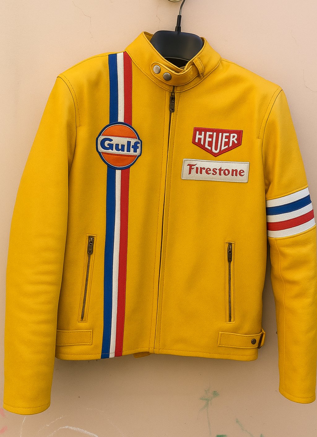 Crafted Leather Yellow with Red White and Blue Stripes Biker Motorcycle Jacket