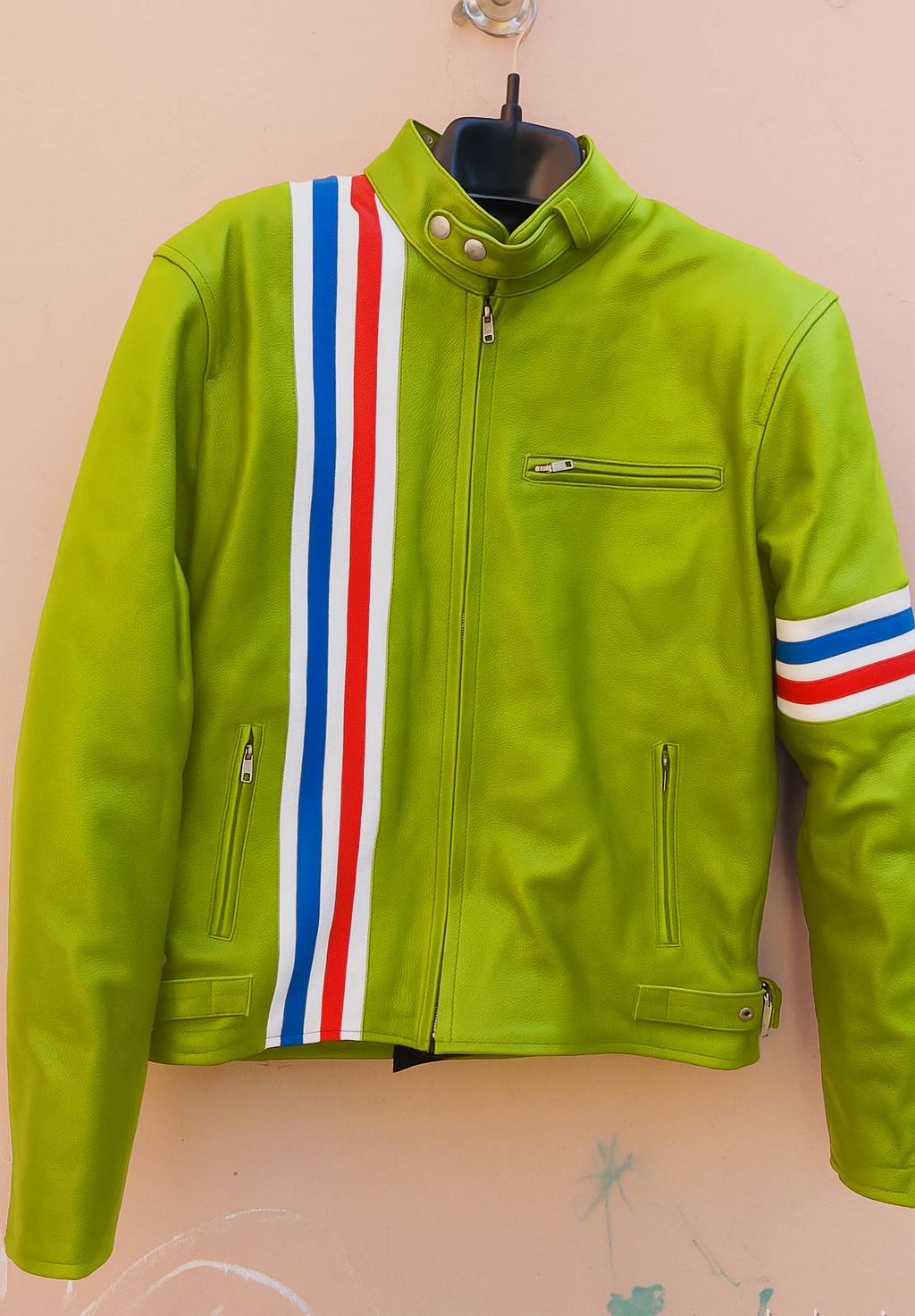 Crafted Leather Classic Designer Mix Color Yellow/Green with Red White and Blue Stripes Biker Motorcycle Jacket