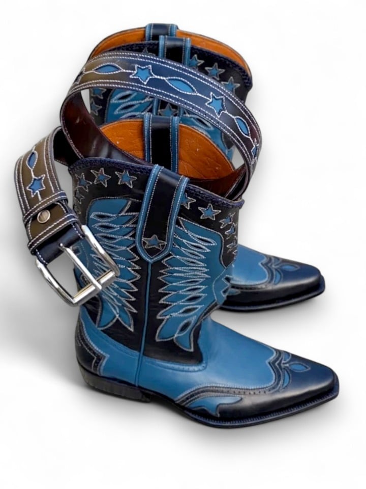 Crafted Leather New Classic Blue Black Men Designer Cowboy Fashion Boot with Matching Belt